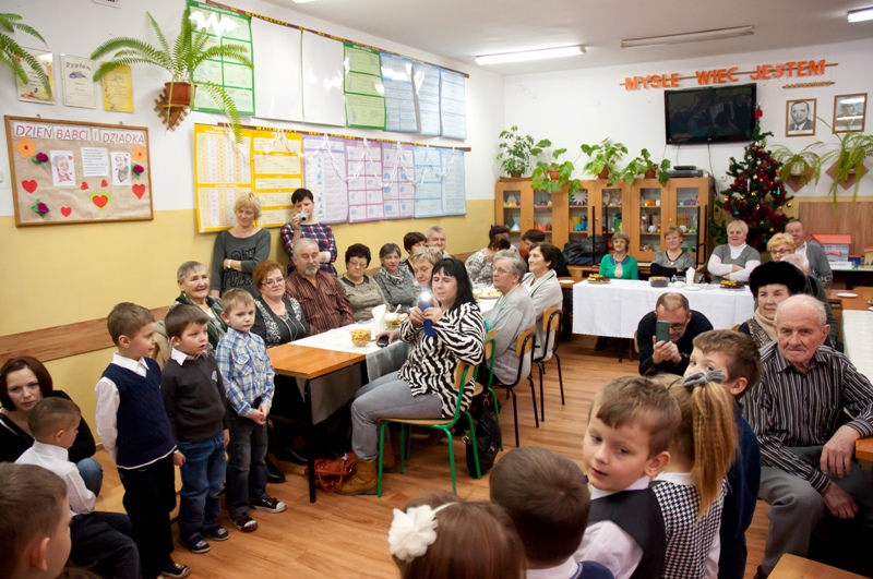 W styczniu obchodzimy Dzień Babci i Dziadka. Święta te mają w Polsce tradycję liczącą ponad pół wieku. Babcia i Dziadek to bardzo ważne osoby w życiu każdego dziecka i dlatego właśnie z tej okazji 23.01.2015 r. w naszej szkole odbyła się uroczystość zorganizowana przez uczniów klasy zerowej wraz z wychowawczynią Barbarą Wolanin. Na widowni zasiedli zaproszeni goście, a dzieci recytowały wiersze oraz śpiewały piosenki. Po części artystycznej zaproszono wszystkich na poczęstunek. Dzieci przygotowały również drobne upominki w postaci laurek i wręczyły je swoim Babciom i Dziadkom. Na zakończenie mogliśmy usłyszeń życzenia skierowane do zgromadzonych seniorów: