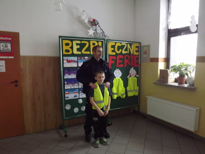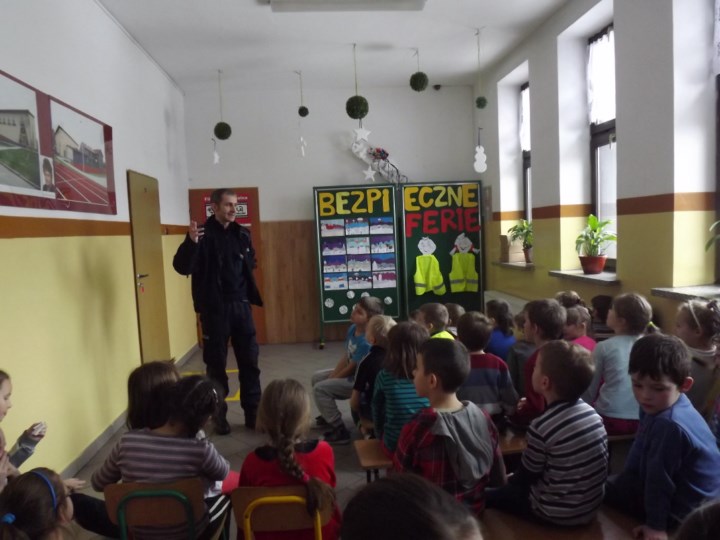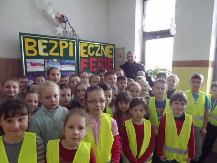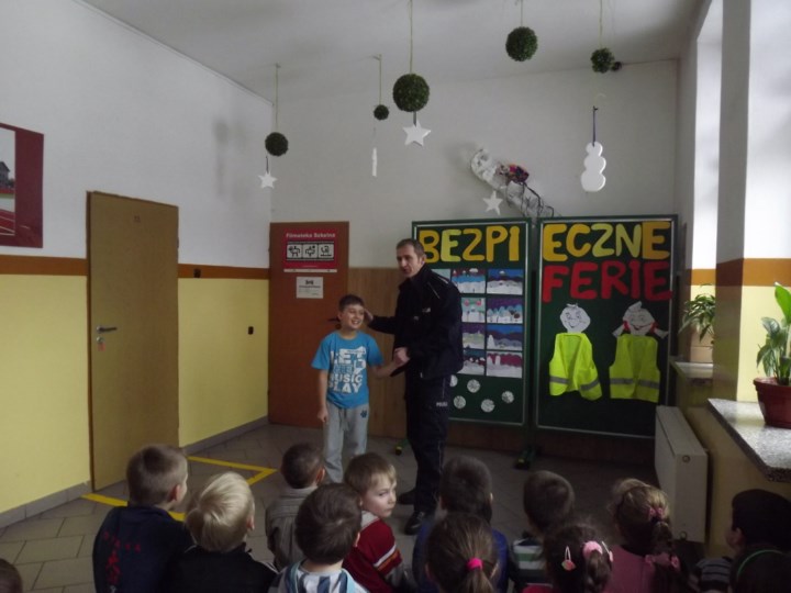 W dn. 11.02.2015 r. uczniowie kl.0-III SP uczestniczyli w ramach akcji „Bezpieczne ferie” w spotkaniu z dzielnicowym Choczni, Panem A. Grzybem. Pan Policjant, ze szczególnym naciskiem, mówił o bezpiecznym poruszaniu się po ulicy oraz przypomniał, jak ważne jest noszenie elementów odblaskowych. Dzieci ćwiczyły scenki, jak asertywnie się zachować, gdy zostaną zaczepione przez nieznajomego.
