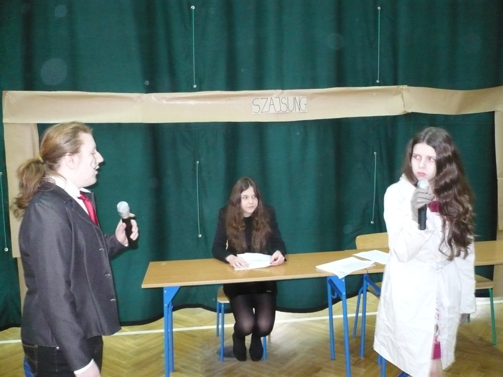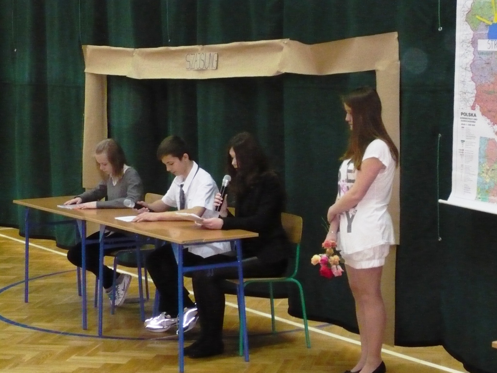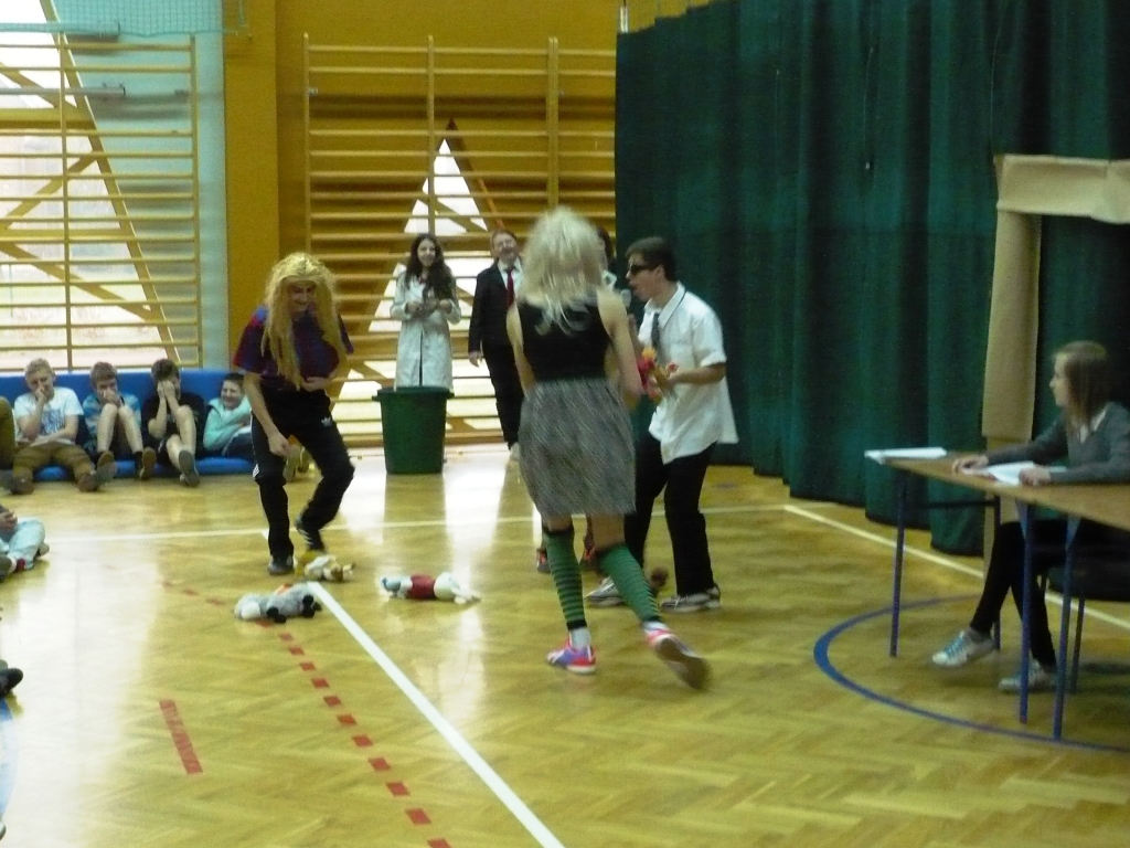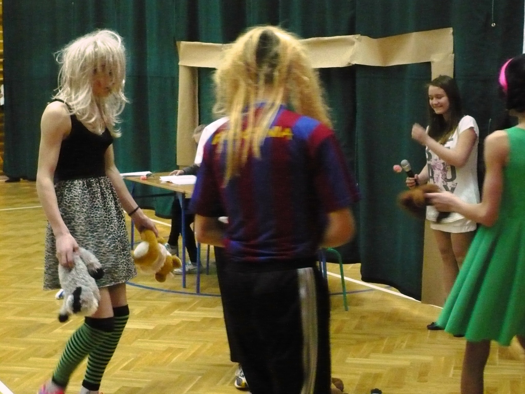 Tego dnia mogliśmy obejrzeć przedstawienie poświęcone kobietom, które wraz z wychowawcą przygotowali gimnazjaliści z klasy II. Było ono przeplatane dużą dawką humoru. Wszyscy doskonale się bawili. W niektórych scenach w kobiece role wcielili się chłopcy, którzy swym zabawnym wyglądem i kunsztem aktorskim doprowadzali publiczność do spontanicznych reakcji. Gimnazjaliści włożyli wiele pracy w przygotowanie swoich ról. W przedstawieniu pojawiły się również autorskie teksty uczennic klasy II.