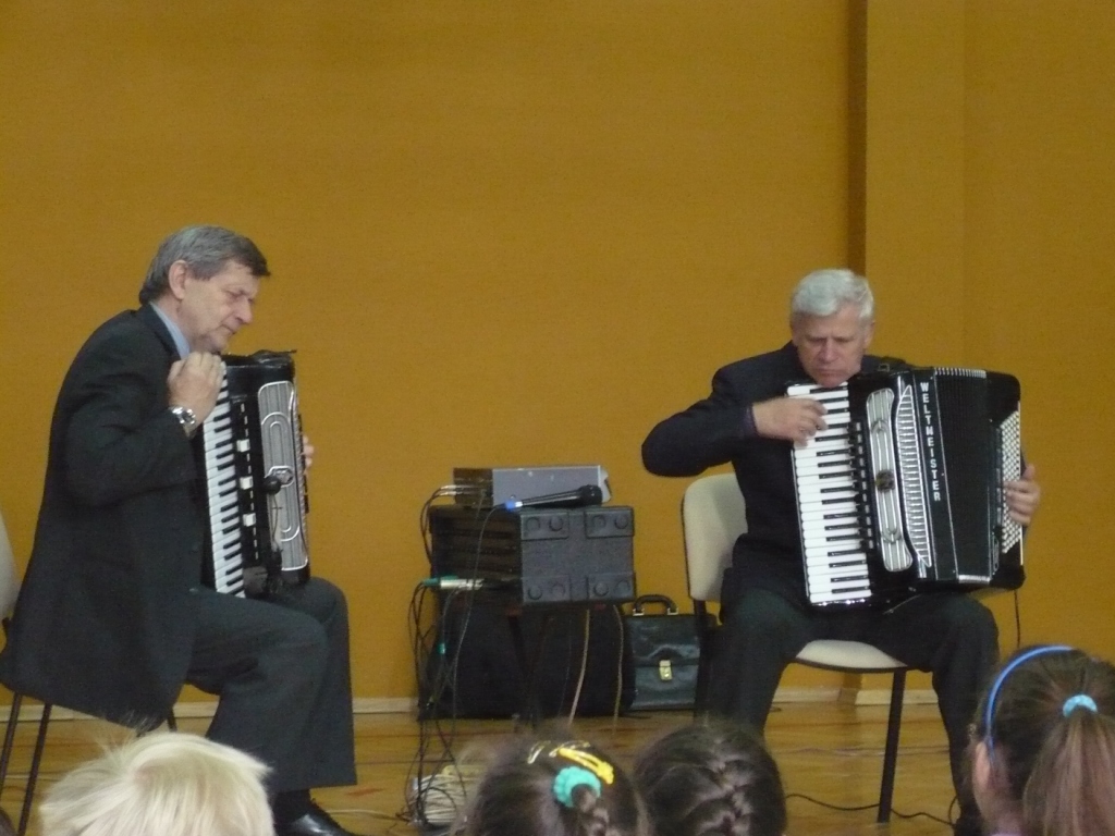 W dniu 4 maja 2015r. odbył się w naszej szkole koncert akordeonowy. Znakomity Łódzki Duet Akordeonowy w składzie pan Zbigniew Sobieraj oraz Kazimierz Barasiński z humorem zaprezentowali nam przeboje muzyki poważnej, rozrywkowej i ludowej. Były to: Marsz turecki - W.A.Mozarta,Pociąg - B. Volmera, Taniec z szablami - A.Chaczaturiana, Polskie Tańce Narodowe, czy Ragtime - S.Joplina.