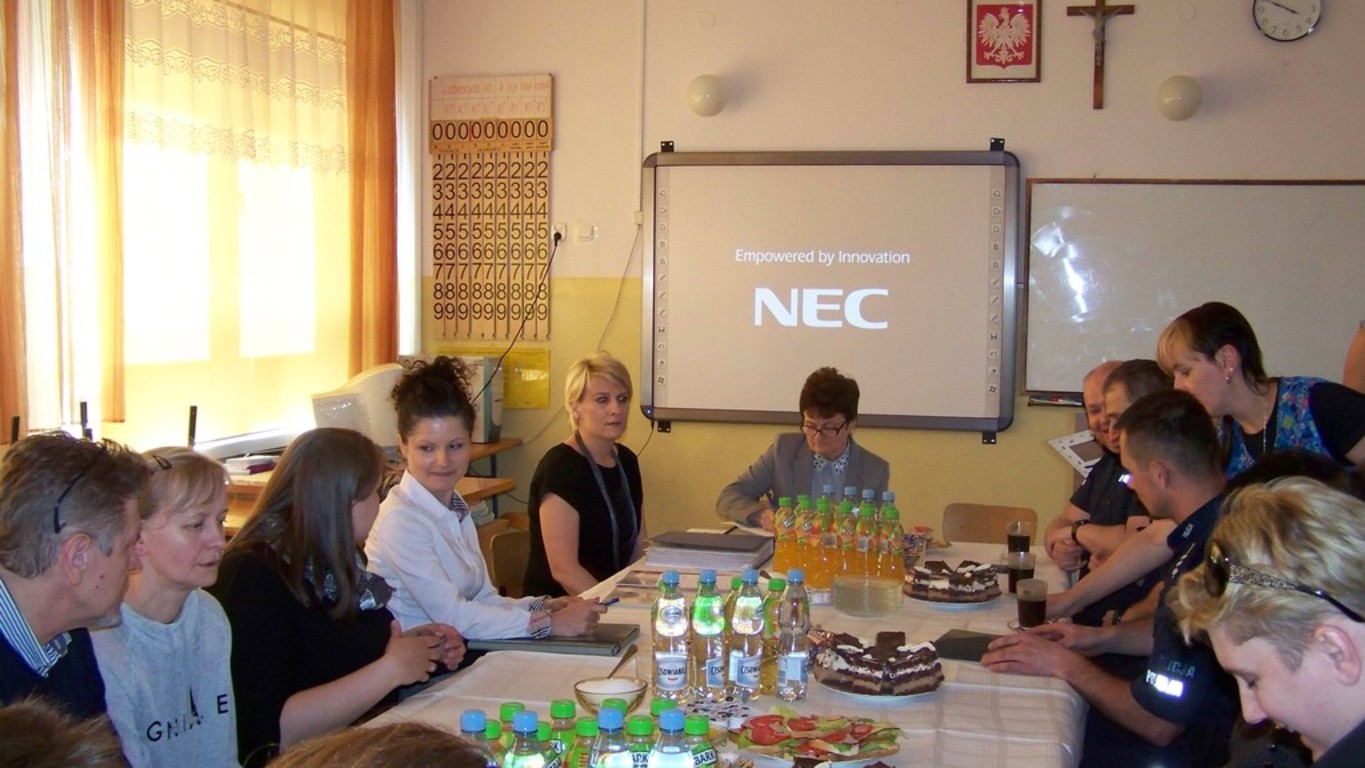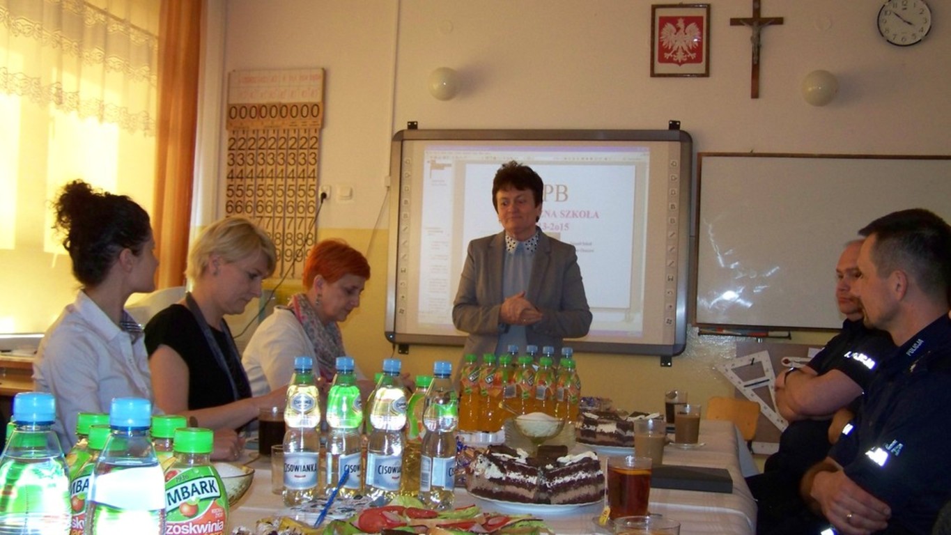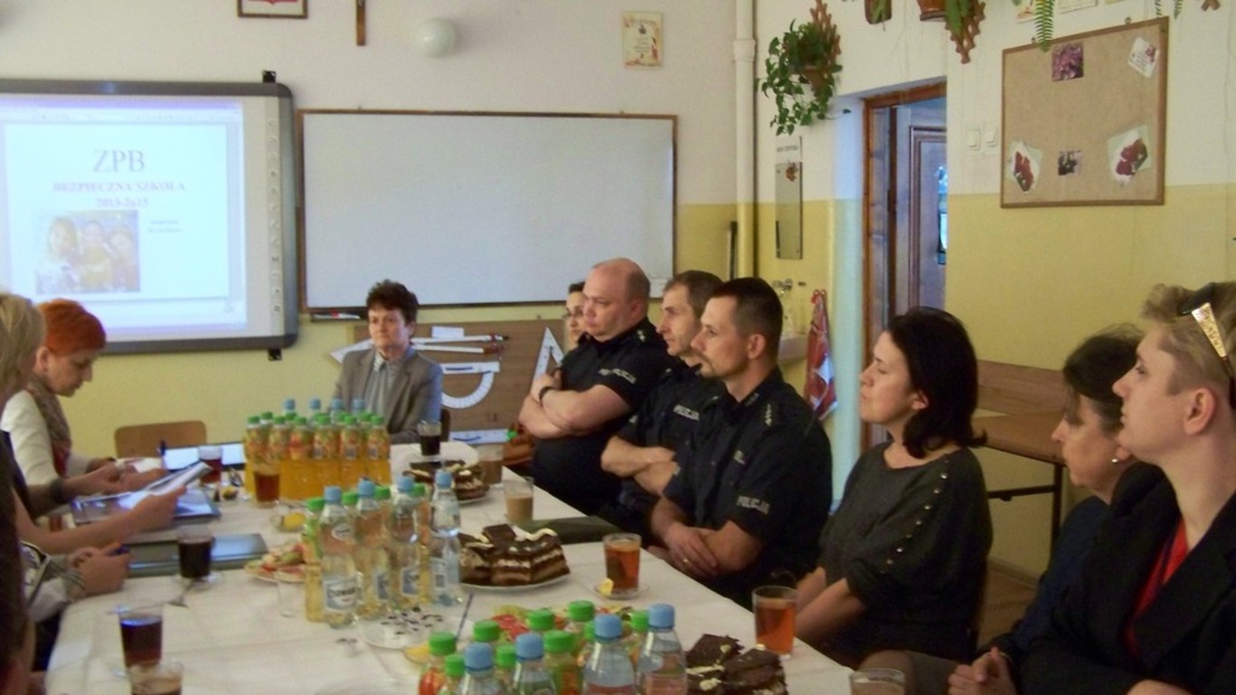 Na wstępie spotkania głos zabrała pani dyrektor M. Bryndza, która przywitała przybyłych gości oraz podała plan spotkania. Następnie pani G. Curzydło – szkolny koordynator projektu, przedstawiła wyniki oraz wnioski i zalecenia z badania ankietowego dotyczącego stanu bezpieczeństwa w szkole, przeprowadzone wśród uczniów, rodziców oraz nauczycieli, a także projekt Zintegrowanego Planu Działania, w którym zostały ujęte podjęte działania i ich dotychczasowe efekty. Zaprezentowana została prezentacja działań poprawiających bezpieczeństwo w szkole za lata 2013-2015. Po prezentacji nadszedł czas na dyskusję. Nasi partnerzy zaproponowali kilka ważnych dla projektu działań. Wszyscy uczestnicy spotkania zaakceptowali przedstawiony plan i zadeklarowali swoją pomoc i wsparcie w realizacji założeń Zintegrowanego Planu Działania przygotowanego przez szkołę. Pan Z. Przybek zauważył, że działania przynoszą efekty, co wykazały obrazowo wyniki ankiet oraz fakt, że do szkoły w ramach współpracy ZPB przyjeżdżają w celu przedstawienia prelekcji profilaktycznych, a nie interwencji, bo ich nie ma. Pan M. Ciepły podkreślił, że śledząc z ramienia pełnionej funkcji współpracę szkół z koordynatorem profilaktyki, nasza szkoła aktywnie uczestniczyła od lat w programach i szkoleniach profilaktycznych.
