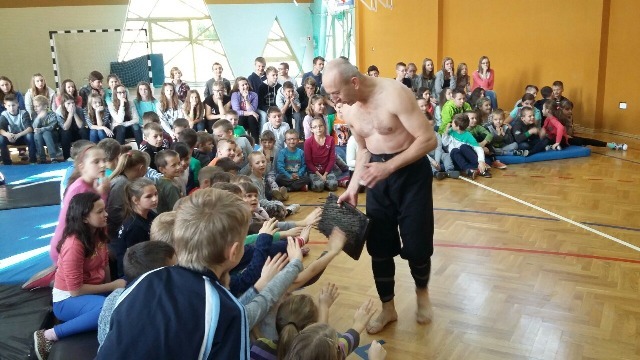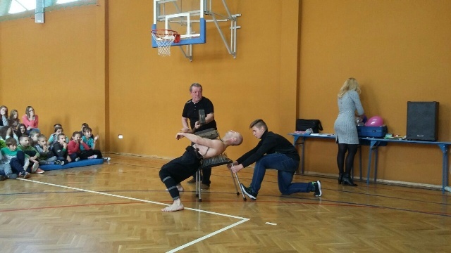 Dnia 28 października naszą szkołę odwiedził Jurij Zinkiewicz - człowiek zagadka, nauczyciel, mistrz. Człowiek niemalże niezniszczalny. Pobił rekord Guinessa i wygrał wiele turniejów sztuk walk. Jest również zawodowym kaskaderem. Zaprezentował 90 minutowy program „Możliwości ludzkiego organizmu”, który mieli przyjemność oglądać uczniowie gimnazjum i szkoły podstawowej. Mogliśmy zobaczyć między innymi jak z lekkością wygina i oplata gruby drut wokół własnej szyi, wchodzi na podest po schodach zrobionych z ostrych mieczy, a następnie zeskakuje z niego na potłuczone szkło. Wszystkiemu towarzyszył autor programu Stanisław Stryjski. Program spotkał się z ogromnym zainteresowaniem dzieci i młodzieży. Mistrz Jurij nagrodzony został rzęsistymi brawami.