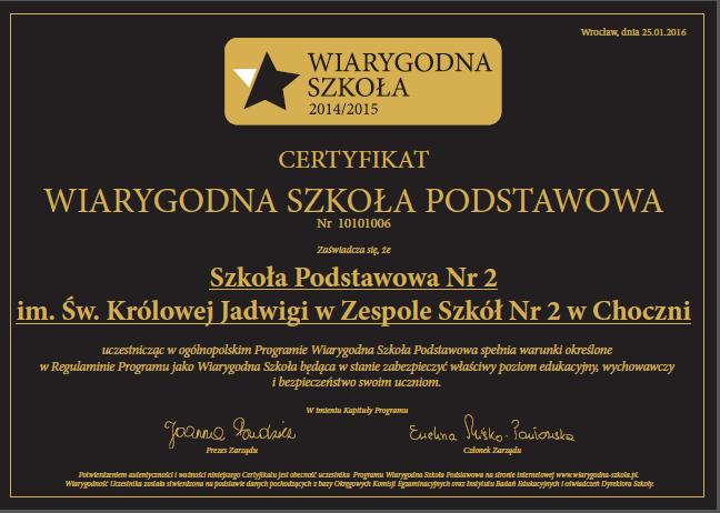 Nasza Szkoła Podstawowa otrzymała Certyfikat WIARYGODNA SZKOŁA. Kategoria Wiarygodna Szkoła Podstawowa jest Programem, który wyróżnia te szkoły podstawowe, które przede wszystkim spełniają wysokie standardy edukacyjne. Są to szkoły, które mogą pochwalić się ciekawą bazą dydaktyczną ale także w pełni zapewniają bezpieczeństwo swoim uczniom, tak ważne dla każdego rodzica.
