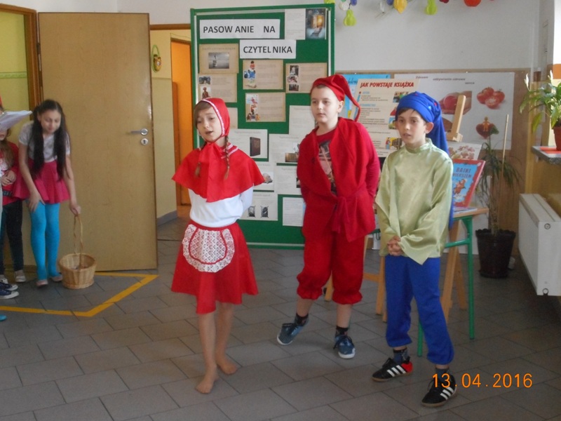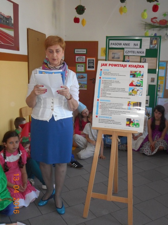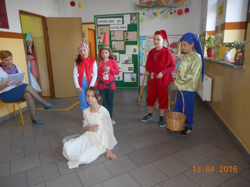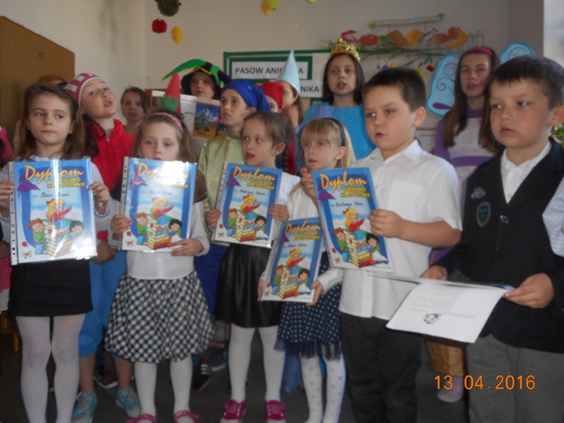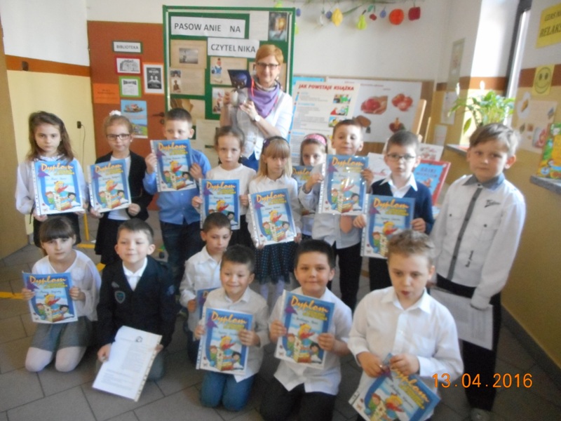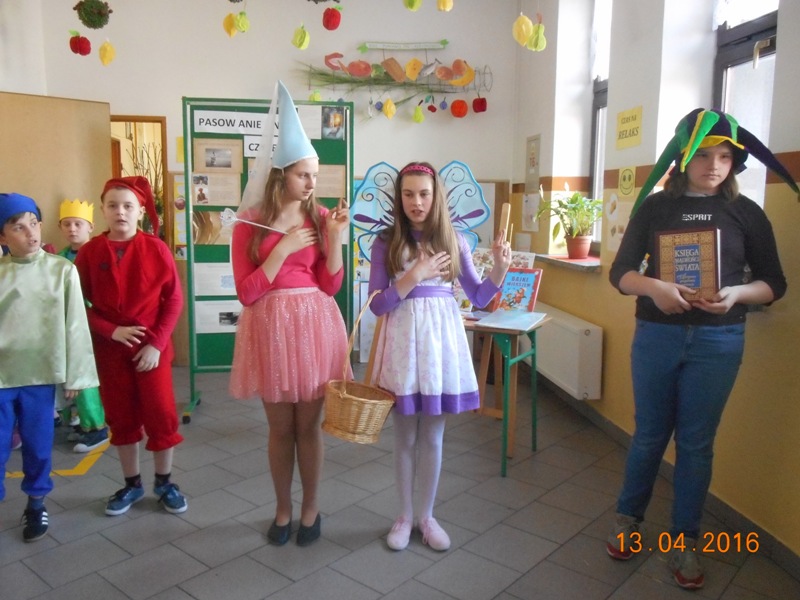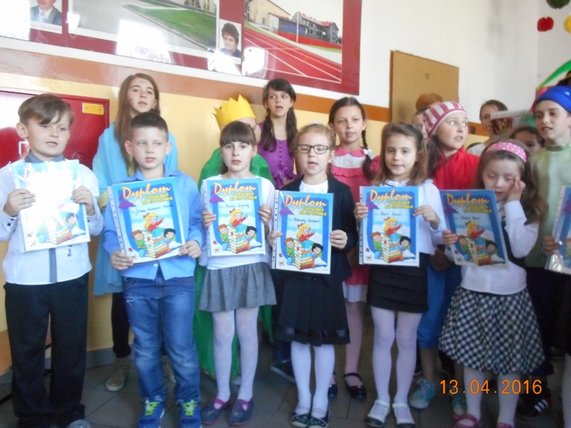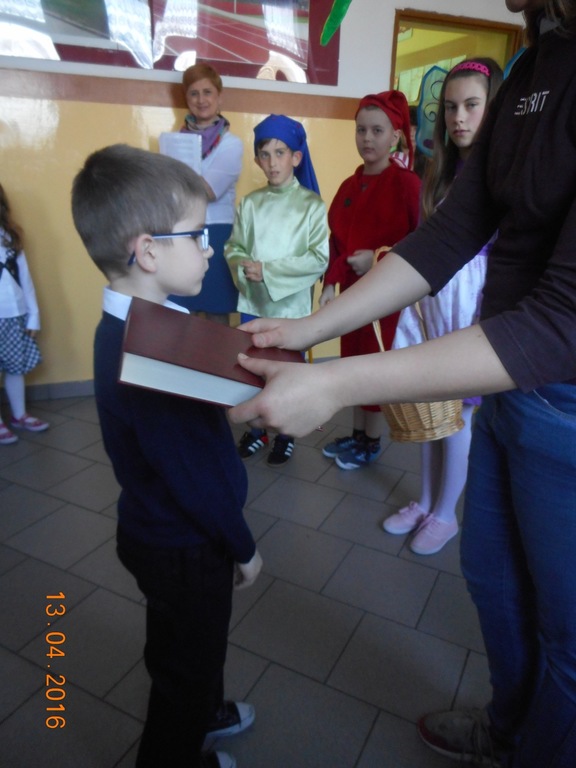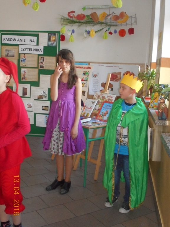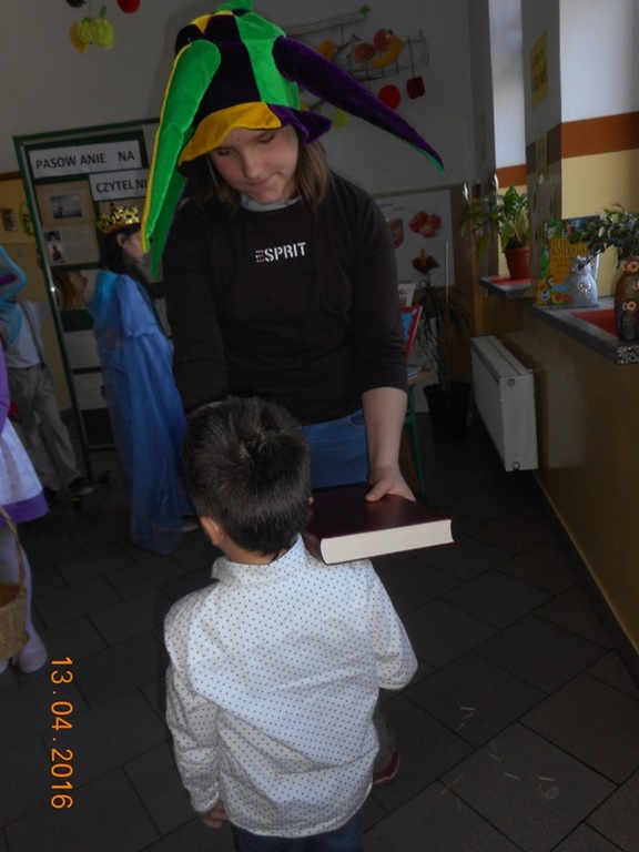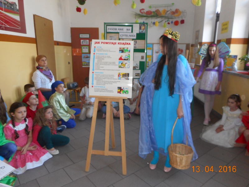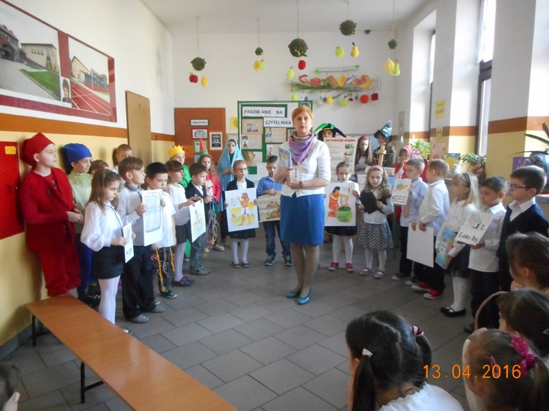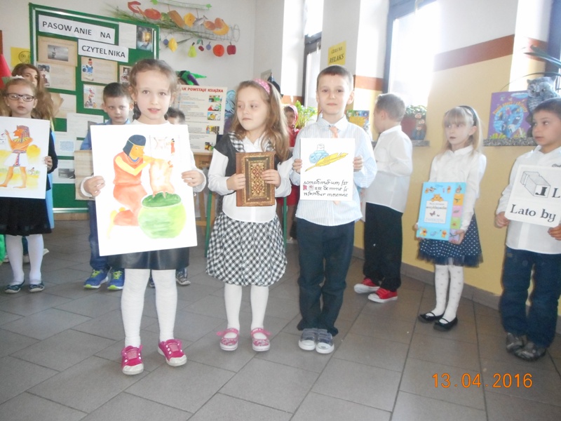 W środę, 13 kwietnia 2016 roku uczniowie klasy pierwszej zostali uroczyście pasowani na czytelnika biblioteki szkolnej. Na początku spotkania pierwszaki, w sposób obrazowy i poparty pięknymi ilustracjami, zaprezentowały krótkie ciekawostki na temat historii książki, pisma, papieru, druku itp. Następnie wystąpili członkowie szkolnego koła teatralnego w bajkowym przedstawieniu pt. „Kłótnia wróżek”, gdzie aktorzy przebrani za znane postacie z bajek prezentowali krótkie scenki. Dzieci miały za zadanie odgadnąć z jakich bajek pochodzą przedstawieni bohaterowie. Pierwszaki poznały też prośby książki oraz nauczyły się krótkiego wierszyka: „Szanuj książki z biblioteki, czy to lato czy też zima, dwa tygodnie każdą książkę w domu możesz trzymać”. Punktem kulminacyjnym było uroczyste przyrzeczenie czytelnika: