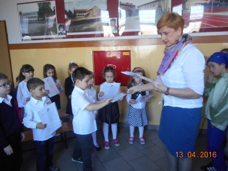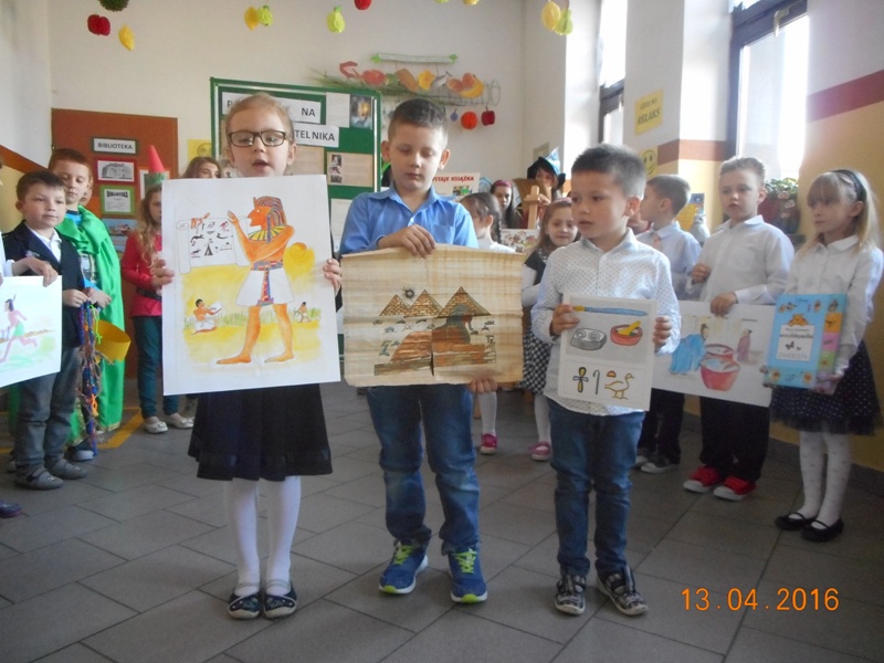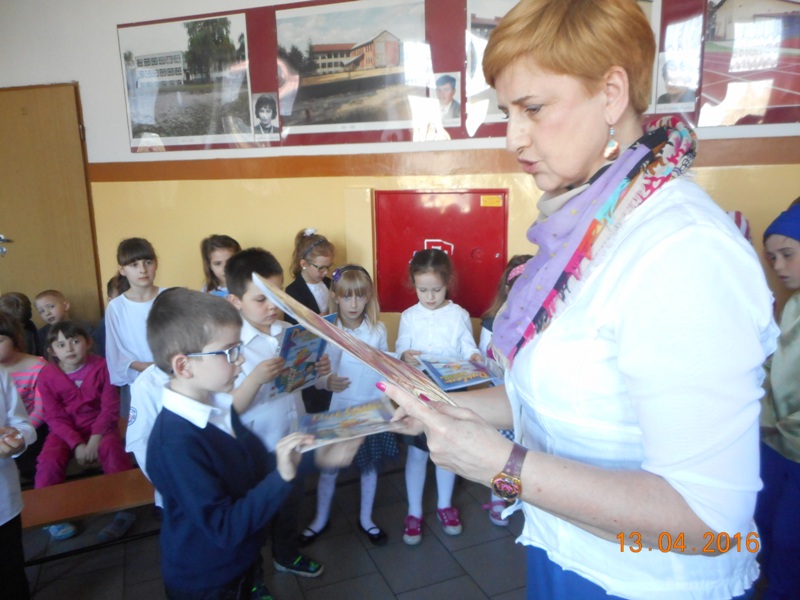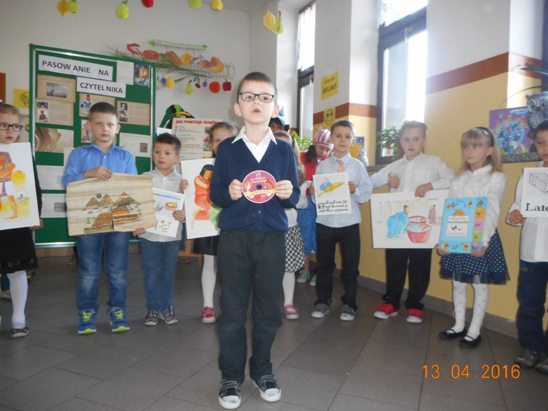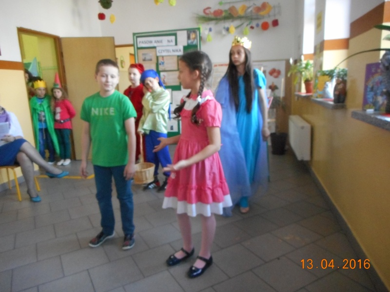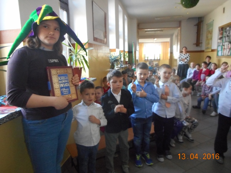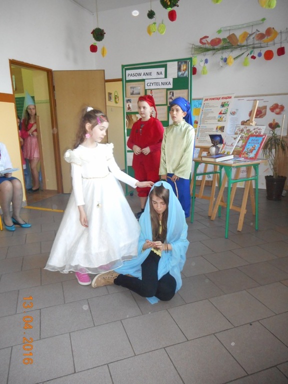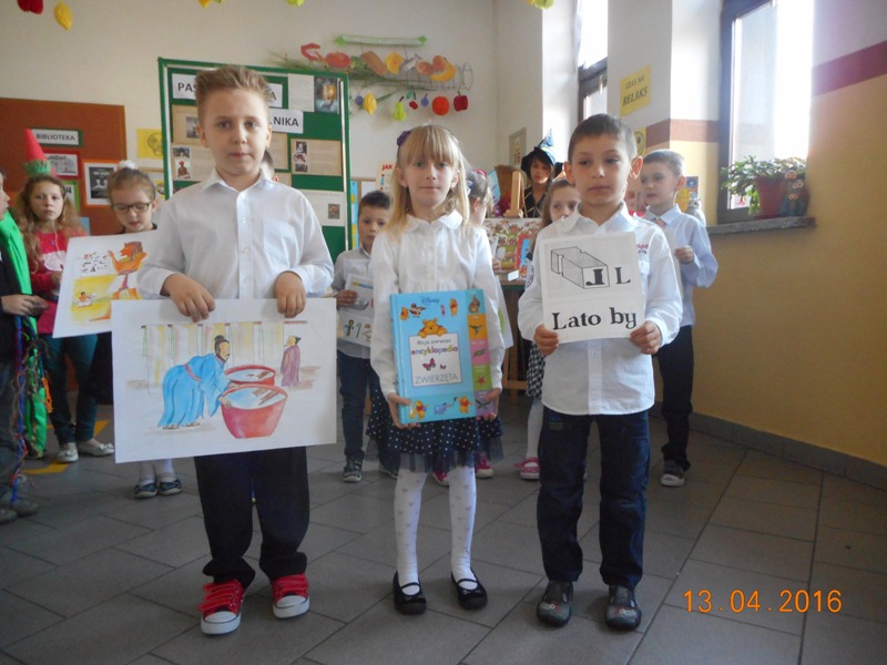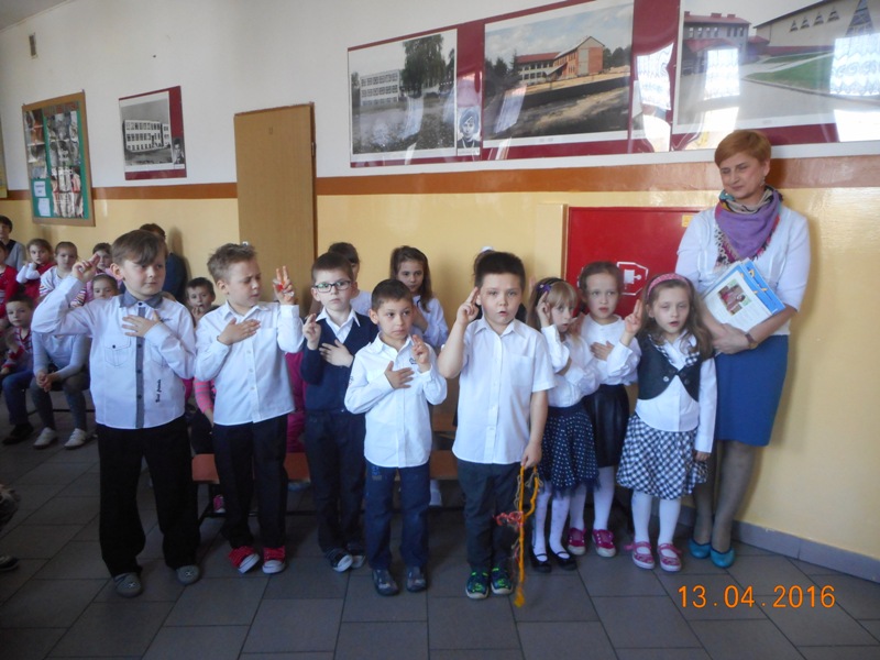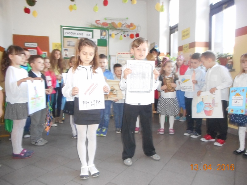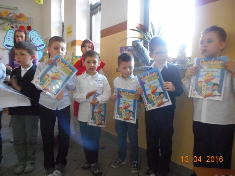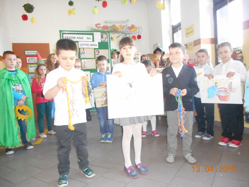 W środę, 13 kwietnia 2016 roku uczniowie klasy pierwszej zostali uroczyście pasowani na czytelnika biblioteki szkolnej. Na początku spotkania pierwszaki, w sposób obrazowy i poparty pięknymi ilustracjami, zaprezentowały krótkie ciekawostki na temat historii książki, pisma, papieru, druku itp. Następnie wystąpili członkowie szkolnego koła teatralnego w bajkowym przedstawieniu pt. „Kłótnia wróżek”, gdzie aktorzy przebrani za znane postacie z bajek prezentowali krótkie scenki. Dzieci miały za zadanie odgadnąć z jakich bajek pochodzą przedstawieni bohaterowie. Pierwszaki poznały też prośby książki oraz nauczyły się krótkiego wierszyka: „Szanuj książki z biblioteki, czy to lato czy też zima, dwa tygodnie każdą książkę w domu możesz trzymać”. Punktem kulminacyjnym było uroczyste przyrzeczenie czytelnika: