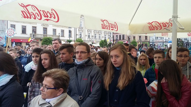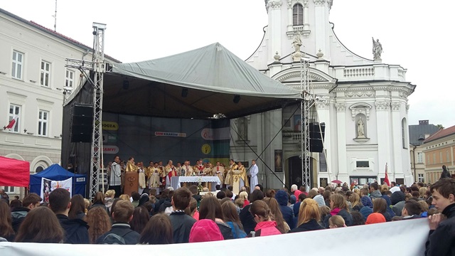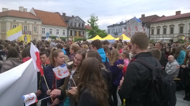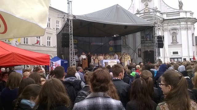 O godz. 10.00 na rynku Ksiądz Biskup Jan Szkodoń odprawił uroczystą mszę świętą dziękczynną za dar osoby i pontyfikatu Jana Pawła II. W trakcie mszy wręczono Prymat przechodni w rodzinie szkół JP II, który w tym roku otrzymał zwycięzca Konkursu na Dzieło Miłosierdzia - Gimnazjum w Juszczynie. W Liturgię Mszy włączyła się młodzież ZS CKU w Radoczy.