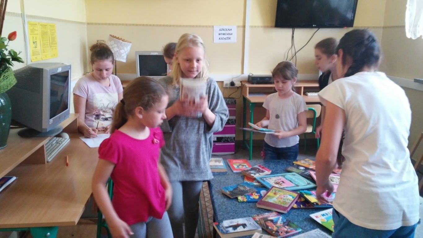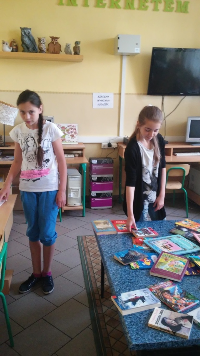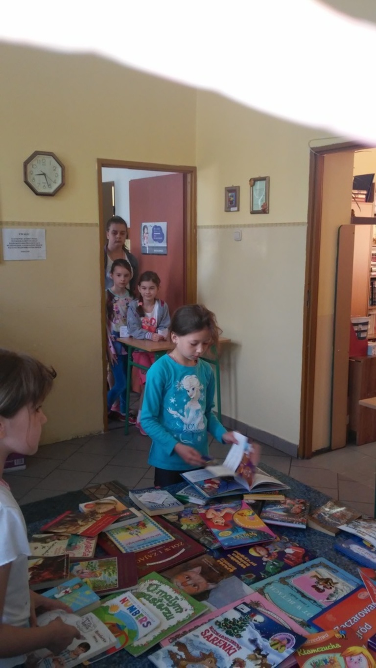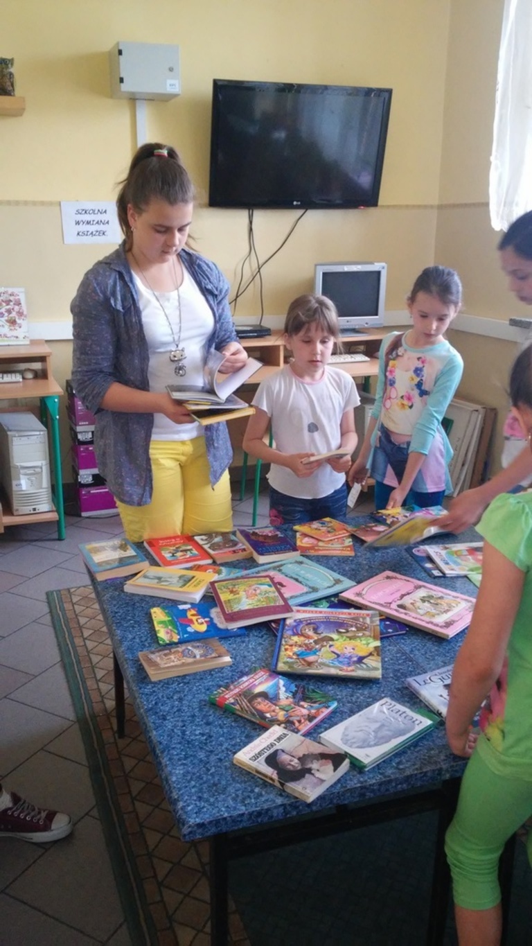 W środę, 15 czerwca 2016 roku w naszej bibliotece miała miejsce kolejna akcja szkolna promująca czytelnictwo – „Wymiana książek między sobą”. Uczniowie przez okres dwóch miesięcy przynosili do biblioteki swoje prywatne książki, które już przeczytali i chcieli je wymienić na inne pozycje przyniesione przez dzieci. To ciekawy sposób promowania czytelnictwa, który spotkał się z zainteresowaniem dosyć licznej grupy czytelników. Nad przebiegiem całej akcji czuwały uczennice z klasy VI – członkinie koła bibliotecznego. Doradzały niezdecydowanym, jaką książkę wybrać, tak aby wszyscy byli zadowoleni. Dzięki temu każdy uczestnik tego wydarzenia wyszedł z biblioteki z nową książką i uśmiechem na twarzy. Dziękujemy wszystkim, którzy zechcieli się podzielić swoimi książkami z innymi i życzymy wesołych wakacji z książką!!!