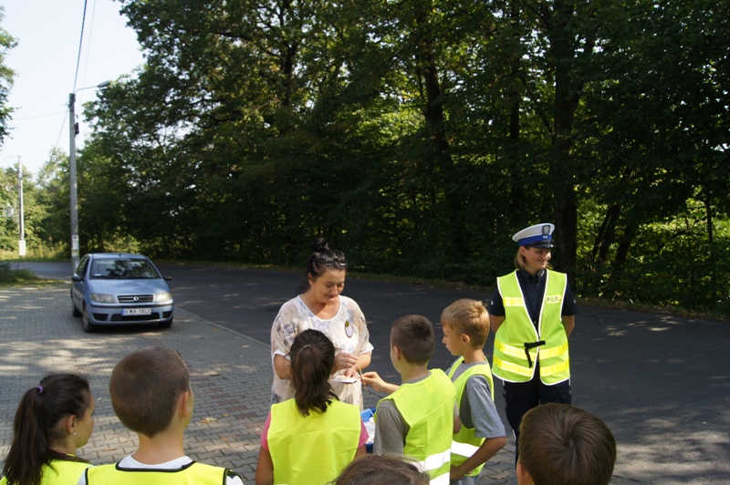 Pierwszy punkt naszego planu działań w ramach konkursu, już za nami. 16 września uczniowie klasy IV, wspólnie z asp. Katarzyną Hermą z Wydz. Ruchu Drogowego KPP w Wadowicach, uczestniczyli w kontroli ruchu drogowego na ul. Głównej. Akcja przebiegała pod hasłem zaczerpniętym z dziecięcej zawołanki: „Ślimak, ślimak pokaż rogi…” - dzieci wręczały kierowcom miniaturowy znak „Stop” z „odblaskowym” ślimakiem, mający przypominać dorosłym o konieczności zdejmowania nogi z gazu, zwłaszcza w terenie zabudowanym oraz w pobliżu szkół i przedszkoli. A ponieważ ślimaka zachęcano do pokazania rogów obietnicą sera na pierogi, także kierowcy byli częstowani serem białym i oscypkiem, które to „załączniki” przygotowały mama i babcia dwójki uczniów. Do każdego kęska dołączony był przepis na świetne pierogi z serem, i może się zdarzyć, że niejeden tata i niejedna mama jedząc pierogi z serem, przypomni sobie, że koniecznie trzeba baczną uwagę zwracać na idące bądź jadące rowerem dzieci! Ślimaki z serem uczniowie rozdawali także w czasie wiejskich dożynek, 18 września.