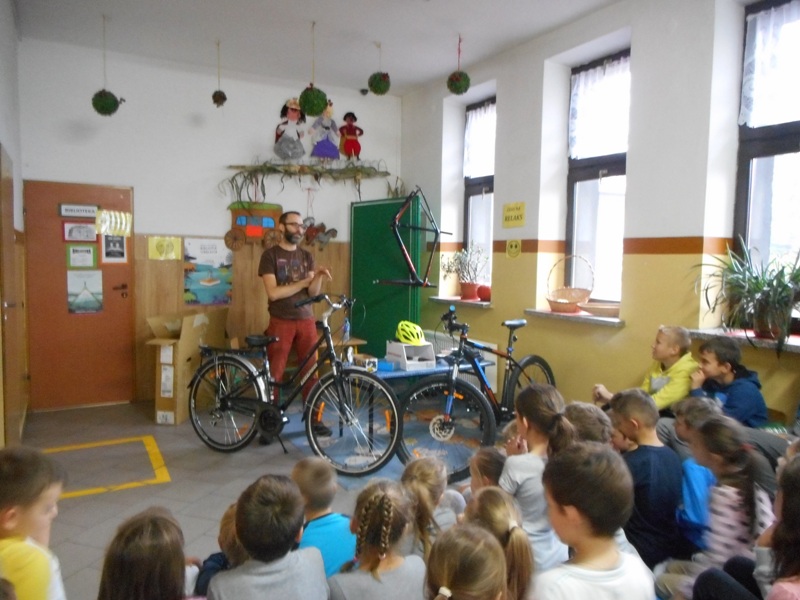 W dn. 12 października w szkole odbyło się spotkanie z panem Danielem Książkiem, byłym uczniem naszej szkoły, który od lat prowadzi sklep z rowerami w Wadowicach. Przeprowadził on z uczniami klas IV- VI pogadankę na temat bezpiecznej jazdy na rowerze. Mówił o niezbędnych elementach roweru takich jak: światła, elementy odblaskowe, kask, kolorowy ubiór. Radził w jaki sposób dopasować rower do wzrostu. Zapoznał dzieci z różnymi ciekawostkami technicznymi, które demonstrował na rowerach.