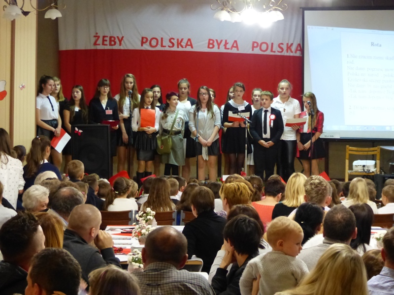 Prezentację pieśni patriotycznych poprzedził krótki rys historyczny związany z rolą tych utworów w życiu narodu wygłoszony przez nauczyciela historii pana Mariusza Rułę. Następnie odśpiewana została „Rota”. Później konferansjerzy z klasy III gimnazjum: Justyna Wcisło i Michał Bienia poprowadzili dalszą część koncertu. Uczniowie byli bardzo dobrze przygotowani, pięknie śpiewali, muzyka chwytała słuchaczy za serce. Na uwagę zasługuje wspaniała wystawa prac plastycznych dzieci i młodzieży związana ze zrywami niepodległościowymi, ich bohaterami oraz symbolami walki o wolność. Przybyłym na uroczystość wręczone zostały foldery prezentujące historię prezentowanych pieśni.