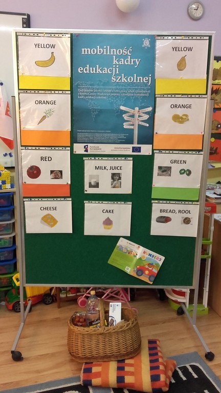 W ramach projektu „Mobilność kadry edukacji szkolnej”, pani Bogumiła Kowalczyk i pani Grażyna Curzydło, przeprowadziły dodatkowe zajęcia z dziećmi z oddziału „O” pod hasłem „English is easy!”. Chciałyśmy udowodnić najmłodszym, że język angielski może być łatwy i przyjemny. Na początku zajęć dzieci obejrzały krótką bajkę po angielsku z serii Świnka Peppa pt. „Piknik”. Po zakończeniu projekcji uczniowie starali się powtórzyć krótkie słówka po angielsku, które zapamiętali. Następnie zorganizowaliśmy piknik na dywaniku, podobnie jak bohaterowie naszej bajki. Z wiklinowego kosza wyciągaliśmy po kolei produkty spożywcze i nazywaliśmy je po angielsku, a także określaliśmy ich kolory. W koszu piknikowym były takie smakołyki jak: gruszka, banan, kiwi, owoc granatu, pomidor, ser żółty, chleb, bułka, mleko, sok, czekolada i ciastka. Nazwy i rysunki wymienionych produktów były umieszczone na gazetce, tak aby dzieci mogły kojarzyć dany wyraz z kolorem. Jako pomoc dydaktyczną wykorzystałyśmy też Ilustrowany słownik angielsko- polski. Miałyśmy również okazję zaznajomić dzieci z nazwami zwierząt po angielsku, wykorzystując do tego celu ciasteczka w kształcie zwierzątek, którymi częstowałyśmy dzieci. Uczniowie chętnie brali udział w zabawie i bardzo się cieszyły jakieś udało im się poprawnie wypowiedzieć jakieś słowo w języku angielskim. Na zakończenie angielskich potyczek słownych rozdałyśmy dzieciom wydrukowane kolorowanki przedstawiające scenki z bajek o świnkach. Mamy nadzieję, że udało nam się wykorzystać poznane podstawy języka angielskiego w celu wyrównania szans edukacyjnych uczniów poprzez zabawę i częste powtarzanie poznanych słów, a także zachęcić do oglądania bajek w obcym języku.