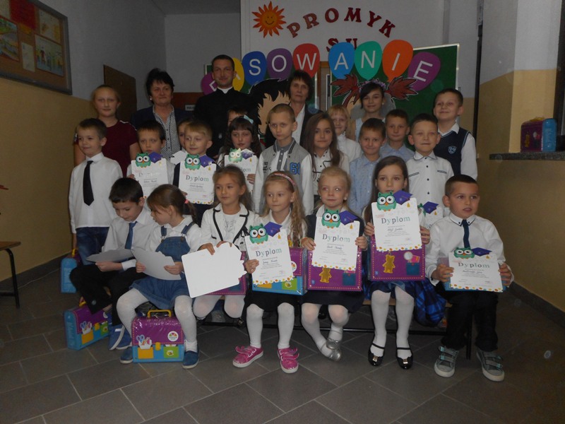 21 listopada 2017r odbyło się uroczyste Pasowanie na ucznia klasy I. Na uroczystość przybyli zaproszeni goście: pani Dyrektor Małgorzata Bryndza, pan wicedyrektor Mariusz Ruła, ksiądz Robert Młynarczyk, nauczyciele, rodzice i dziadkowie oraz dobra wróżka, która obdarowała dzieci darami. Następnie uczniowie wykazywali się swoimi umiejętnościami i wiadomościami zdobytymi w szkole dotyczącymi naszej ojczyzny, ruchu drogowego i zachowania się w szkole. Po czym złożyły uroczyste ślubowanie oraz zostały pasowane przez panią Dyrektor na ucznia. Dzieci otrzymały pamiątkowe dyplomy i kuferki pełne skarbów, które będą pomagać im w dalszej nauce.