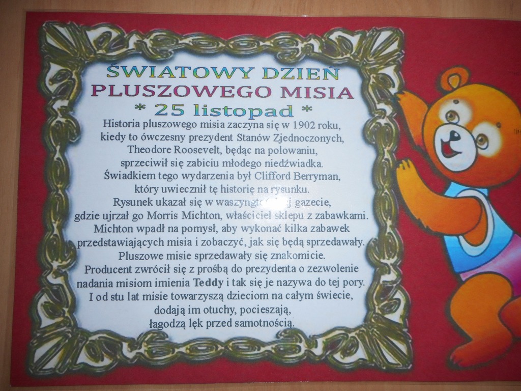 Ten dzień był pełen niespodzianek. Przynieśliśmy z domu swoje misie. Wykonaliśmy piękne prace plastyczne, które wszystkim podobały się. Niespodzianką był tort ,,Miś” wykonany przez panią Monikę oraz misiowe ciasteczka upieczone przez panią Asię.