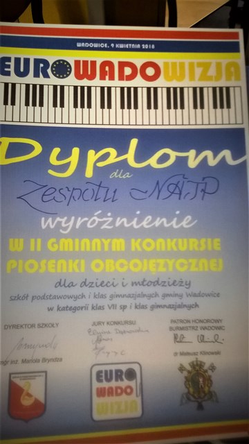 09 kwietnia 2018 roku, uczennice naszej szkoły Justyna Góralczyk i Weronika Hornik wzięły udział w finale II Gminnego Konkursu Piosenki Obcojęzycznej, który odbył się w Szkole Podstawowej Nr 2 w Wadowicach. Nasze uczestniczki wystąpiły jako zespół pod nazwą NATP i zaśpiewały piosenkę Lukasa Grahama pt. „7 years”. Za swój debiutancki występ Justyna i Weronika zostały wyróżnione w III kategorii wiekowej - klasy VII szkoły podstawowej oraz II-III gimnazjum. Należy dodać, iż do konkursu uczennice przegotowywał Pan Zbigniew Kolber – nauczyciel muzyki. Nad poprawnością wymowy czuwała Pani Magdalena Gryga – nauczyciel języka angielskiego.