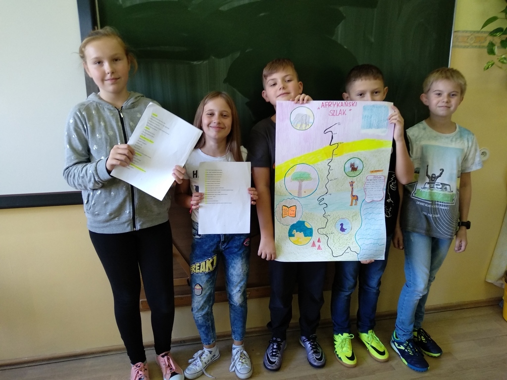 Uczniowie klasy Va i Vb mieli ostatnio okazję poczuć afrykańskie klimaty. A to za sprawą lektury "W pustyni i w puszczy" H. Sienkiewicza. Na lekcjach języka polskiego tworzyli mapę z trasą podróży Stasia i Nel. Zaznaczali na niej główne miasta, w których dzieje się akcja książki oraz rysowali najbardziej charakterystyczne zwierzęta oraz rośliny Afryki. Nie zabrakło lwów, skorpionów, słoni, baobabów oraz palm kokosowych.