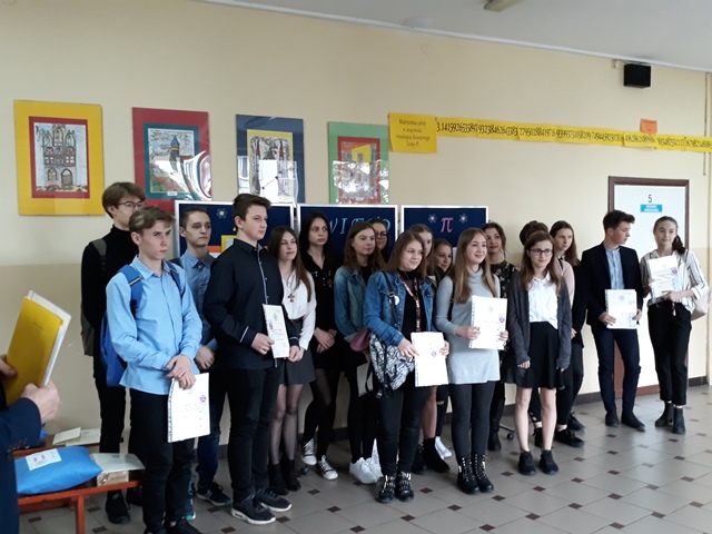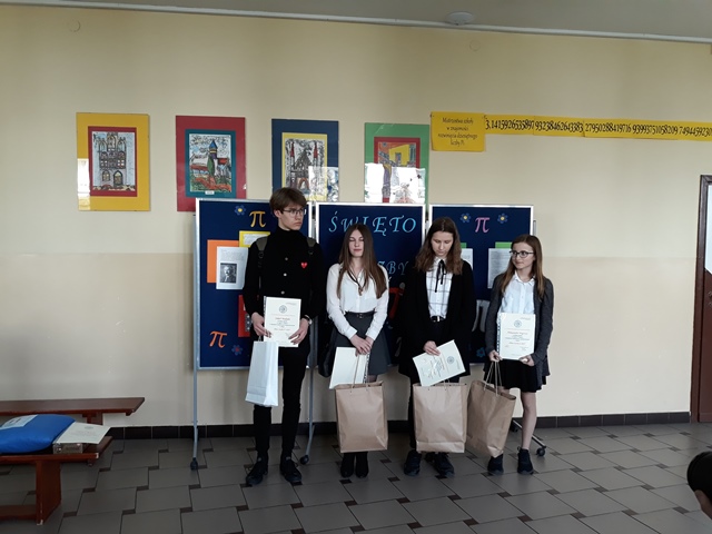 Dnia 14 marca uczniowie naszej szkoły wzięli udział w konkursie matematycznym zorganizowanym z okazji „Dnia Liczby π 2019” w Szkole Podstawowej nr 5 w Wadowicach. Basia Warchał, Karolina Dyduch i Tomasz Bryndza - uczniowie klasy III gimnazjum zmagali się z zdaniami matematycznymi związanymi z liczbą π. Test zadaniowy składał się z 20 zadań typu Prawda/Fałsz. W każdym z 20 zadań uczeń odpowiadał na trzy pytania. Zadania były oceniane w następujący sposób: wybór poprawny 1 punkt, wybór błędny – 1 punkt, brak wyboru 0 punktów. Za bezbłędnie rozwiązany test uczeń klasy trzeciej gimnazjum mógł otrzymać maksymalnie 60 punktów. Basia Warchał uzyskała 48 punktów i zdobyła II miejsce.