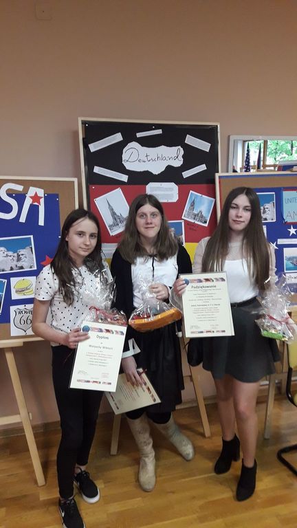 W dniu 14.05.2019r. w Szkole Podstawowej nr 4 w Wadowicach odbył się Gminny Konkurs Wiedzy o Krajach Niemieckojęzycznych i Anglojęzycznych. Naszą szkołę dzielnie reprezentowały Wiktoria Guzdek, Barbara Warchał i Wiktoria Warpacha. Uczniowie pisali 60-minutowy test zawierający pytania zarówno w języku angielskim, niemieckim, jak i polskim, który następnie został oceniony przez jury. Rywalizacja była bardzo zacięta. Wprawdzie nie udało się stanąć na podium, ale wyniki, które uzyskaliśmy, były bardzo wysokie. Wielkie gratulacje dla dziewczyn, które tak dzielnie walczyły w konkursie.