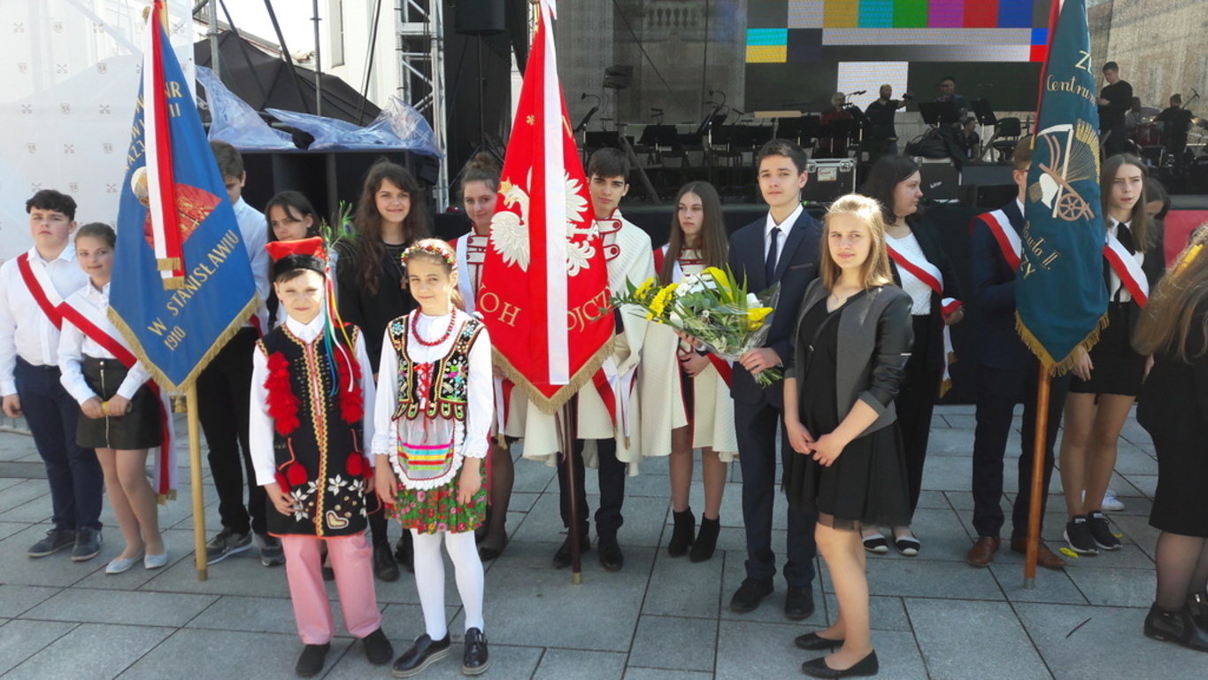 18 maja w 99. rocznicę urodzin Karola Wojtyły na Rynku w Wadowicach odbył się zlot szkół, których patronem jest św. Jan Paweł II. Nasza szkoła była jednym z organizatorów wydarzenia. W uroczystości wzięła udział delegacja uczniów wraz z p. dyrektor - Małgorzatą Bryndzą, p. wicedyrektorem - Mariuszem Rułą oraz wychowawcą klasy III gimnazjum - p. Anną Wolanin. Na początku miał miejsce barwny, rozśpiewany pochód, w którym delegacje z pocztami sztandarowymi oraz uczniowie przemaszerowali spod S.P. nr 2 na wadowicki Rynek. Tam odbyły się występy artystyczne i można było spróbować przysmaków na stoiskach przygotowanych przez Koła Gospodyń Wiejskich z gminy Wadowice i Andrychów. Wtedy również rozłożono banery z zaproszeniem papieża Franciszka na przyszłoroczną, 100. rocznicę urodzin Jana Pawła II. Ich zdjęcie zostanie przesłane do Watykanu. Następnie odprawiono uroczystą mszę w Bazylice Ofiarowania Najświętszej Maryi Panny, której przewodniczył kardynał Stanisław Dziwisz.