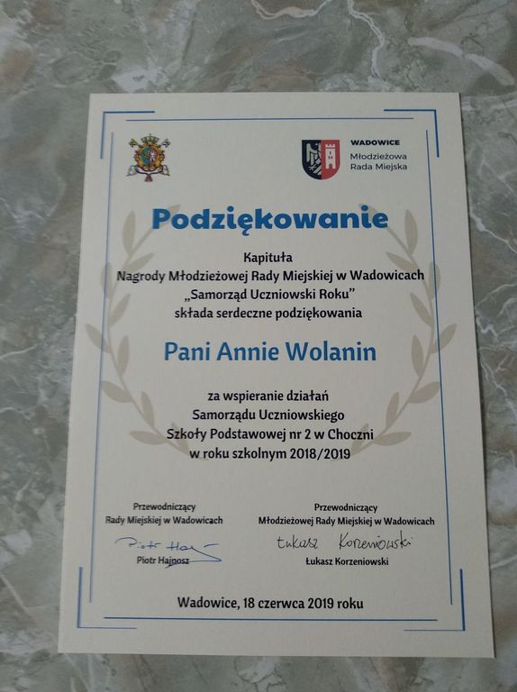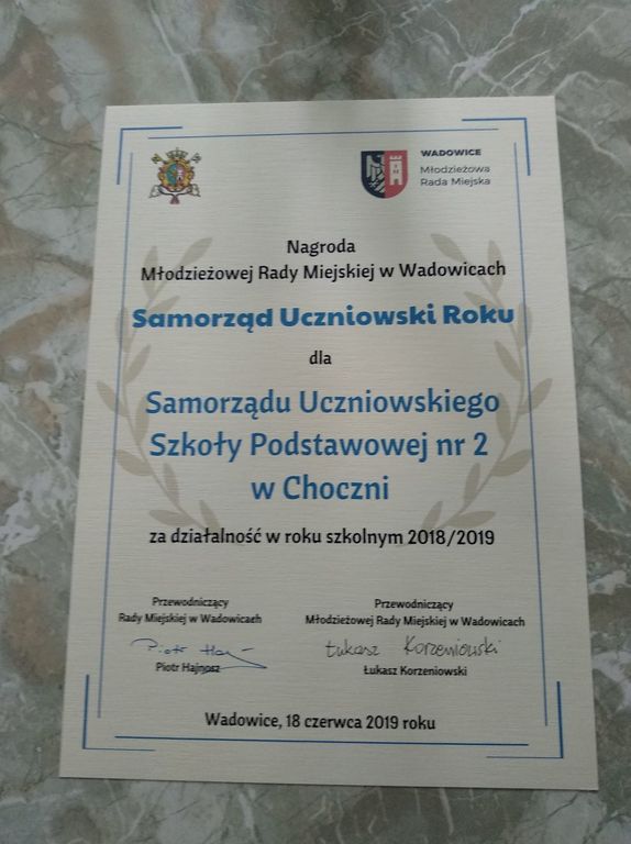W dniu 18 czerwca w Wadowickim Centrum Kultury odbyło się uroczyste wręczenie nagród za osiągnięcia naukowe oraz aktywną działalność samorządową uczniów przyznawanych przez władze gminy. Szkoła Podstawowa nr 2 w Choczni zdobyła główną nagrodę w kategorii „Samorząd Uczniowski Roku” ufundowaną przez Młodzieżową Radę Miasta, którą odebrała pani Anna Wolanin (opiekunka Samorządu Uczniowskiego) wraz z dwoma przedstawicielkami uczniów - Barbarą Warchał i Klaudią Góralczyk.