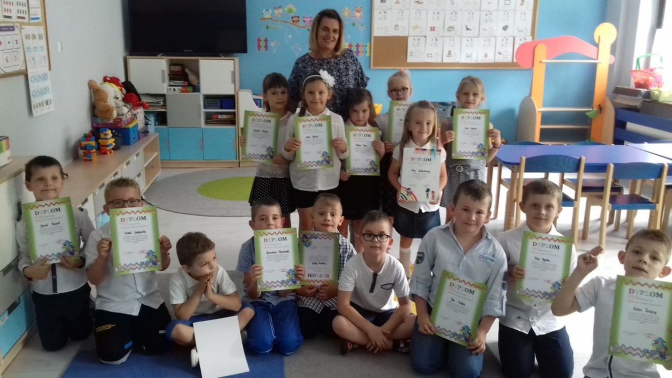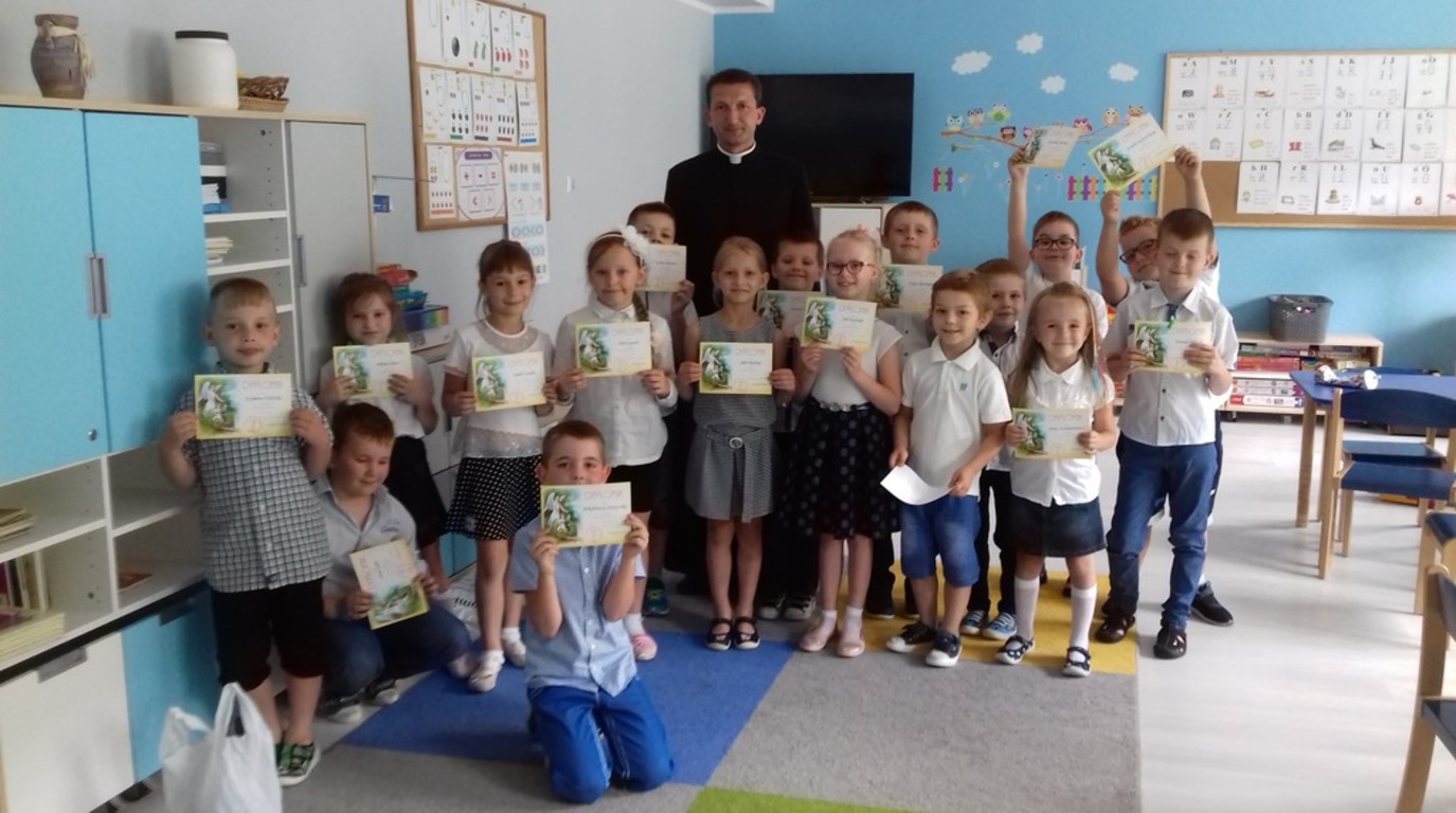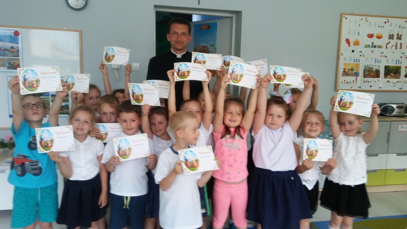 Przedszkolaki z ,,Leśnego Przedszkola" uroczyście pożegnały rok szkolny. Pani Dyrektor oraz ksiądz Robert każdemu dziecku wręczyli pamiątkowy dyplom.