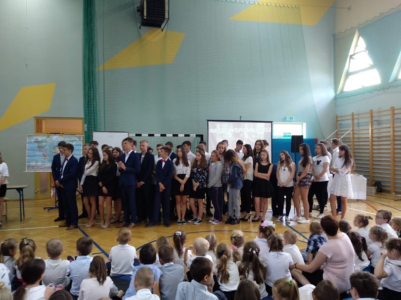 W dniu 18 czerwca żegnaliśmy klasę VIII i III gimnazjum. Obie klasy przygotowały filmiki, w których uczniowie wspominali kilka ostatnich lat spędzonych w szkole. Ponadto klasa VIII zaprezentowała krótkie, pełne humoru wypowiedzi o każdym nauczycielu. Natomiast uczniowie z klasy III gimnazjum wcielili się w wybranych nauczycieli i w żartobliwych scenkach odegrali wybrane lekcje. W międzyczasie klasa VII uhonorowała odchodzące roczniki pamiątkowymi medalami. Po występach artystycznych odbyło się uroczyste wręczenie nagród za wyniki w nauce oraz sukcesy w konkursach i zawodach.