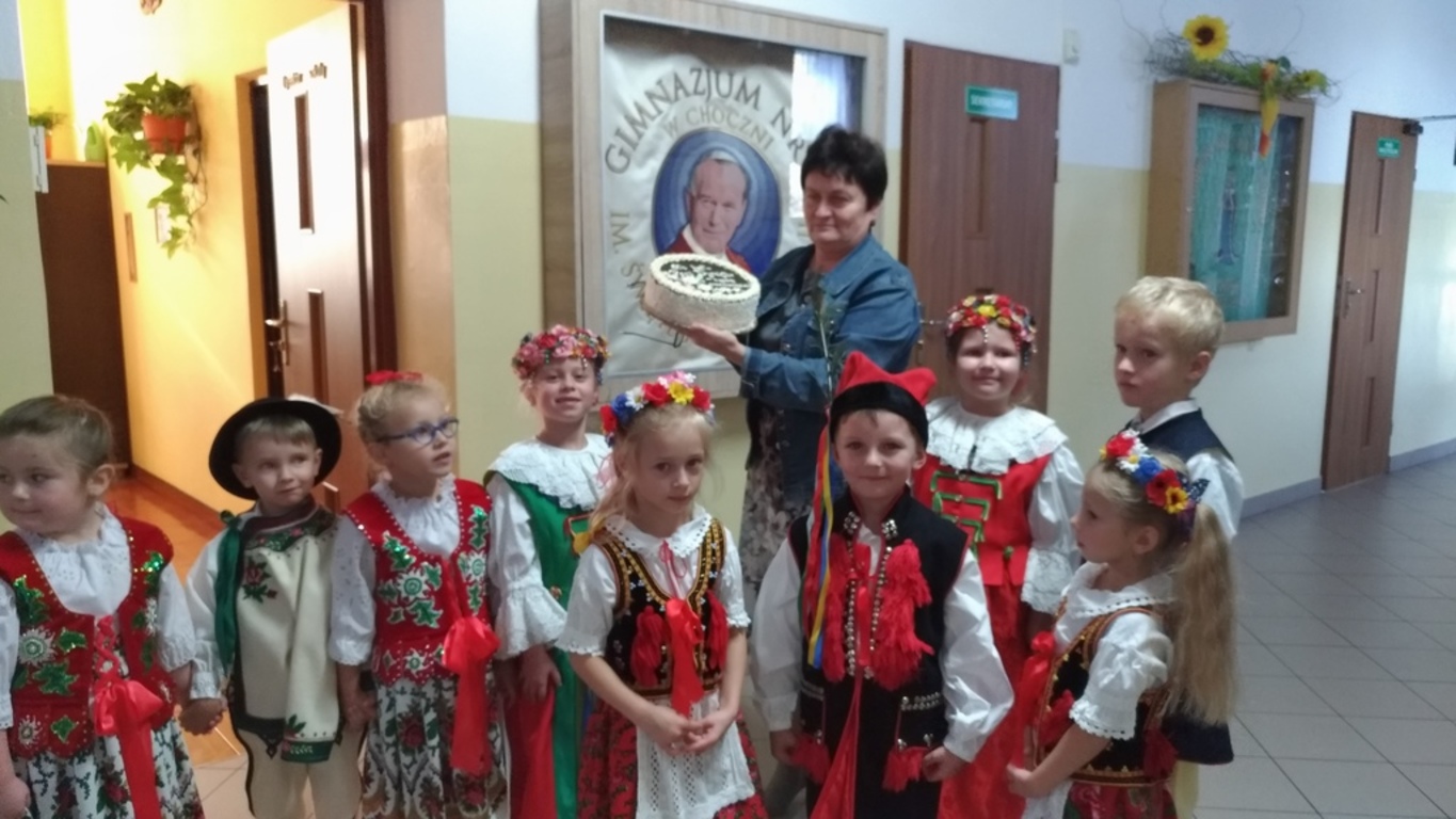 We wtorek 22 października dzieci z ,,Leśnego Przedszkola” , ubrane w stroje ludowe, złożyły życzenia pani dyrektor Małgorzacie Bryndzy z okazji Dnia Dyrektora Szkoły i Przedszkola. Zaśpiewały 100 lat i wręczyły słodki upominek. Pani Dyrektor bardzo wzruszona i zadowolona podziękowała wszystkim za pamięć.