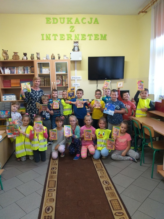 Biblioteka szkolna również czynnie włączyła się w akcję edukacyjną „Odblaskowa szkoła”. Pani bibliotekarka zaprosiła do czytelni pierwszaków, którym na głos przeczytała jedną z książeczek z serii Przygody Fenka pt. „Ruch drogowy”. Po wysłuchaniu opowiadania uczniowie chętnie odpowiadali na pytania dotyczące treści, które związane były z bezpiecznym poruszaniem się po drodze. Następnie każde dziecko zapoznało się z zawartością książki pt. „Z Agatką na drodze”, w której znajdują się przepisy ruchu drogowego oraz wszystkie znaki drogowe. Dzieci miały też możliwość obejrzeć biblioteczną wystawkę książek i czasopism tematycznie związanych z omawianym zagadnieniem. Pierwszaki miały na sobie odblaskowe kamizelki, a także różnorakie gadżety.