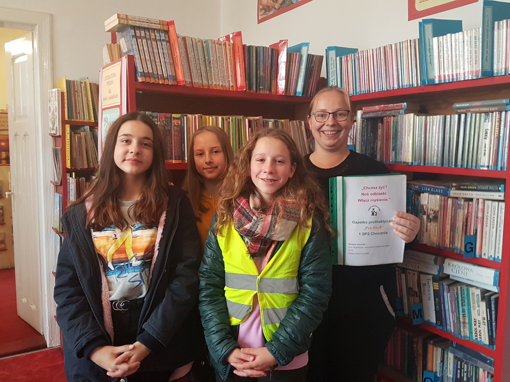 Podsumowaniem akcji „Bezpieczny senior” było odwiedzenie przez grupę uczennic z kl. VII Filii Biblioteki Publicznej w Choczni i przekazanie gazetki „ProFiluś” i ulotek dla czytelników którzy odwiedzają czytelnię.