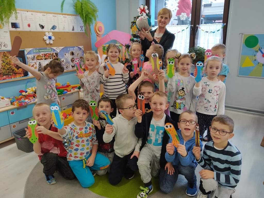Potem do naszej sali zaprosiliśmy panią Bogusię, która przeczytała nam opowiadanie związane ze świętami. Na zakończenie wykonaliśmy zakładki do książki. Wspólne zdjęcie zakończyło to miłe i pouczające spotkanie.
