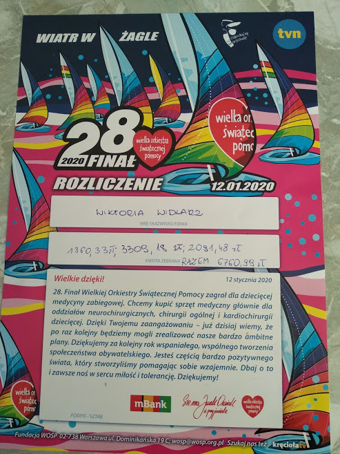 W naszej szkole również odbyła się zbiórka pieniędzy na Wielką Orkiestrę Świątecznej Pomocy Jerzego Owsiaka. Wolontariuszki Wiktoria Widlarz z kl.V oraz koleżanka ze szkoły SP 1 w Choczni Julia Lach, w dniu 10 stycznia przeszły po wszystkich klasach naszej szkoły. Odwiedziły również oddziały Leśnego Przedszkola.
