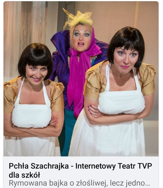 Z okazji Międzynarodowego Dnia Teatru proponuję uczniom, nauczycielom i rodzicom obejrzenie przedstawienia teatralnego pt. „Pchła Szachrajka”. Rymowana bajka o złośliwej, lecz jednocześnie inteligentnej i słodkiej pchle, uwielbiającej robić psikusy, to klasyka literatury dziecięcej. Wielki tupet i jeszcze większy spryt oraz wdzięk, pozwalały jej wychodzić obronną ręką z opresji, które sama wywołała. Gdy wreszcie wyrokiem sądu została skazana za swoje za swoje psoty, ze łzami w oczach obiecała poprawę, przeszła głęboką przemianę i odtąd była tak uczciwa, jak to tylko w bajkach bywa…. Realizacja telewizyjna spektaklu Teatru Narodowego „Pchła Szachrajka” Jana Brzechwy, w reżyserii Anny Seniuk, to propozycja nie tylko dla dzieci. https://iteatr.tvp.pl/47108736/pchla-szachrajka