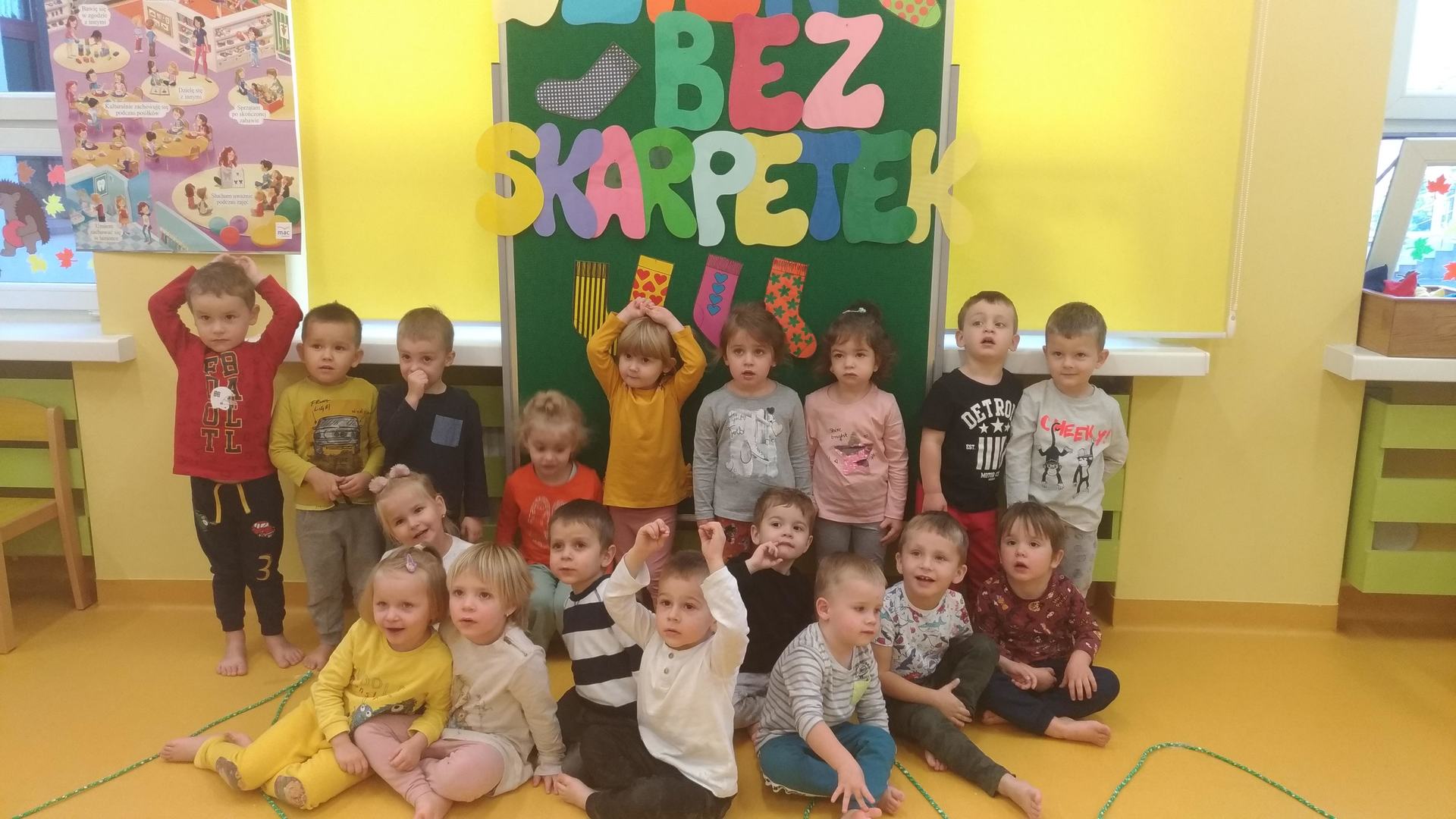 W czwartek obchodziliśmy „Dzień bez skarpetek”. Dzieci z grupy Jeżyki postanowiły to święto uczcić. O tym jak ważna jest kondycja naszych stóp nie trzeba nikogo przekonywać. Wiele osób w wieku dorosłym boryka się z wieloma dolegliwościami i deformacjami. Warto więc już od najmłodszych lat nauczyć się odpowiedniego dbania o stopy. O ile chodzenie boso porą jesienną i zimową niekoniecznie będzie możliwe (choć w letnie pory roku polecamy jak najbardziej!) to wykonanie różnych prostych i ciekawych ćwiczeń stóp – jak najbardziej (oczywiście na boso).