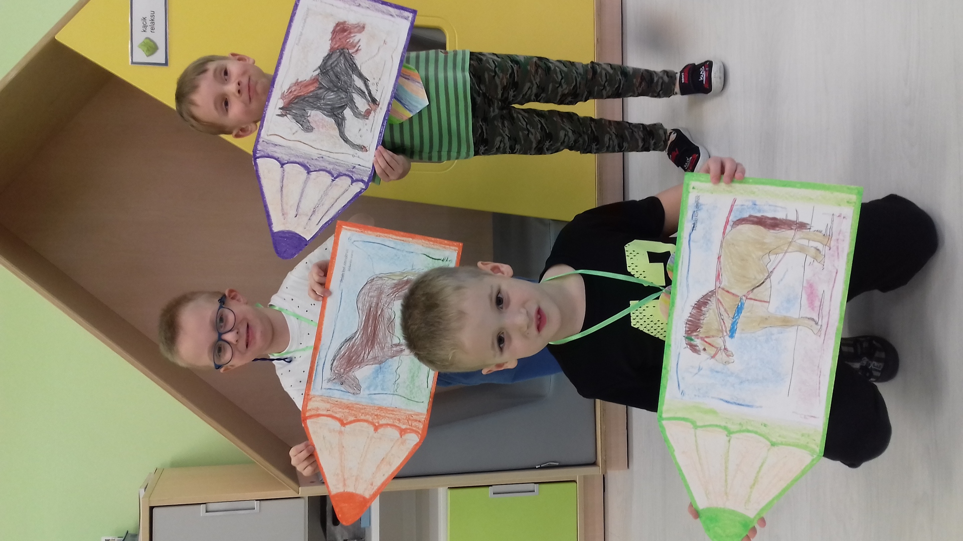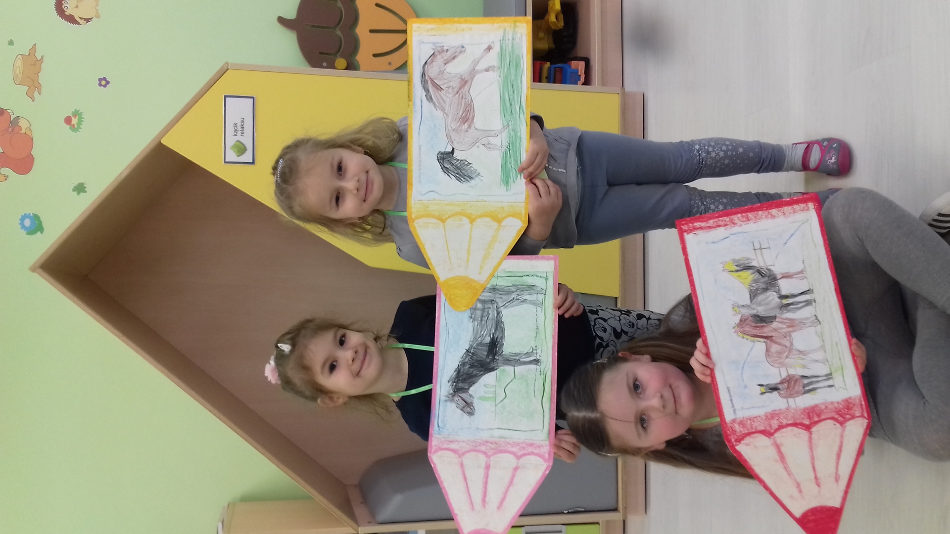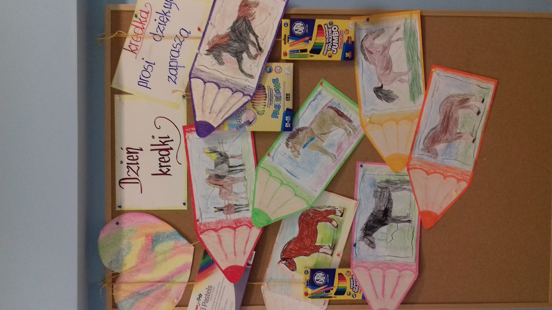 Rozpoczęlismy ten dzień od piosenki "Kolorowe kredki". Oglądaliśmy film edukacyjny "Jak powstaje kredka?" Poznaliśmy różne rodzaje kredek. Układaliśmy je według wielkości, przeliczaliśmy, tworzyliśmy z nich ciekawe wzory i obrazki. Ponieważ w naszej grupie kredka to przyjaciel każdego przedszkolaka, zrobiliśmy wspólne kredkowe serca - każdy kolorował każdemu w myśl zasady "Zgoda buduje, niezgoda rujnuje". Podsumowaniem dnia była wystawa prac wykonanych kredką "Polskie konie". Uśmiechnięci i zadowoleni zakończyliśmy dzień wspólnym temperowaniem kredek.