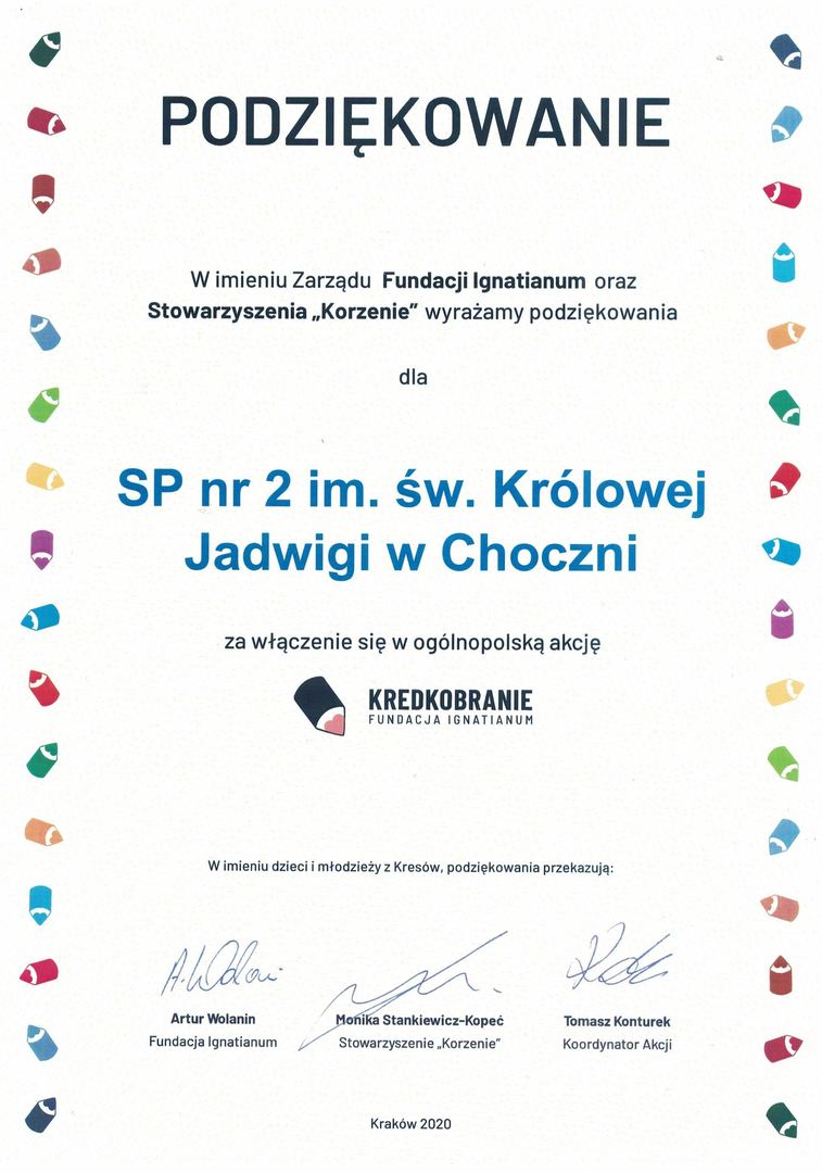 Mimo trwającego stanu epidemii, nasza szkoła po raz drugi wzięła udział w ogólnopolskiej akcji Kredkobranie. Nasi uczniowie pokazali, że nie zapominają o najmłodszych rodakach na Kresach. Na ręce Pani Dyrektor zostały wysłane podziękowania dla całej społeczności szkolnej za włączenie się do akcji. Nadszedł więc czas na podsumowanie akcji, w której przekazaliśmy 100 zeszytów, 60 długopisów, ołówków i bloków, 50 paczek kredek oraz wiele, wiele innych artykułów papierniczych. W sumie zebraliśmy prawie 350 sztuk. Wszystkie przybory szkolne trafiły już do potrzebujących dzieci na Kresach. Dziękujemy wszystkim, którzy przyłączyli się do tego przedsięwzięcia.