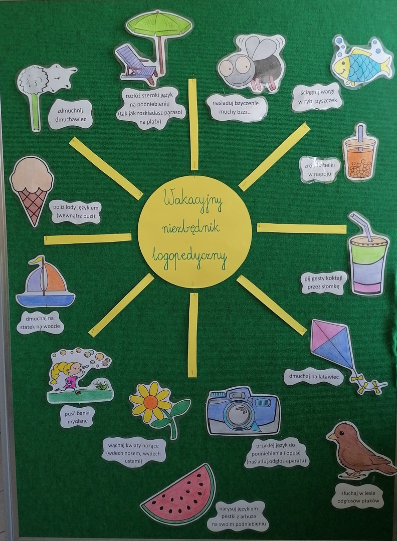W ostatnim tygodniu przed wakacjami pani logopeda odwiedziła grupę „Sowy” z propozycjami ćwiczeń podczas letniego wypoczynku. Dzieci zapoznały się z aktywnościami i ćwiczeniami logopedycznymi, oddechowymi i słuchowymi, które bez problemu będą mogły wykonać w czasie wakacji. Każdy dostał do domu propozycje tych ćwiczeń. Ponadto na górnym korytarzu szkolnym pojawiła się gazetka z wakacyjnym niezbędnikiem logopedycznym.