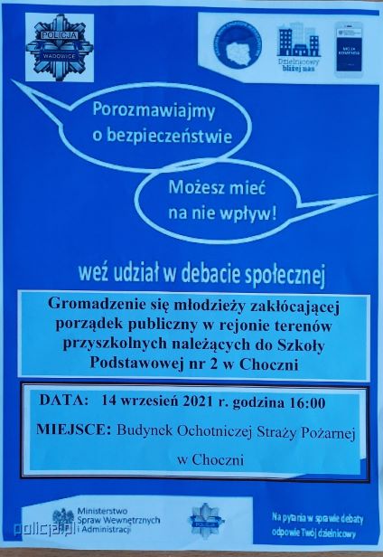 Dnia 14 września o godzinie 16.00 w budynku OSP w Choczni, odbedzie się debata społeczna na temat zakłócania porządku publicznego przez młodzież w rejonie terenów przyszkolnych należących do naszej szkoły.