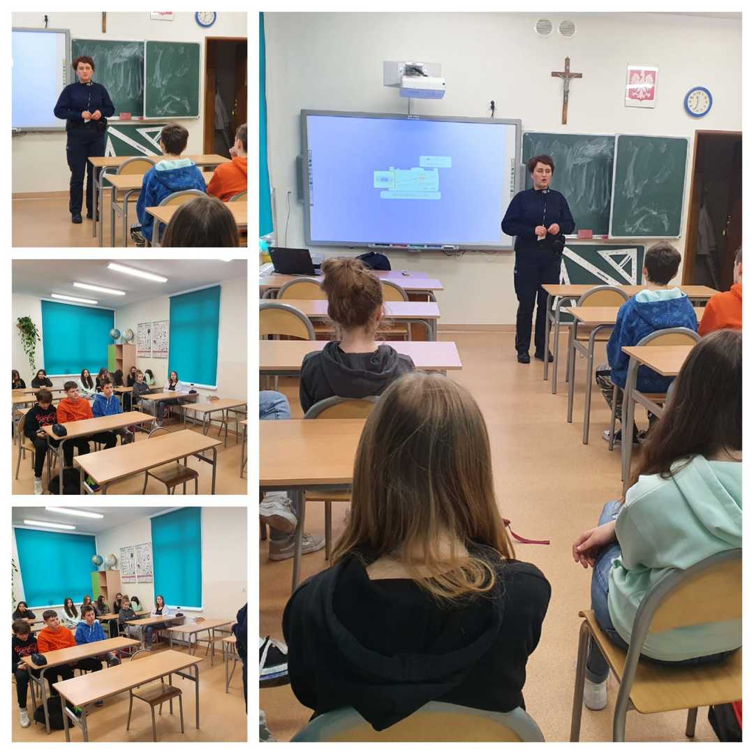 We wtorek 05.04.2022r. przedstawicielka z Komendy Powiatowej Policji w Wadowicach z Zespołu ds. Nieletnich i Patologii asp. szt. Małgorzata Hombesch przeprowadziła pogadankę profilaktyczną” w klasach VIII.