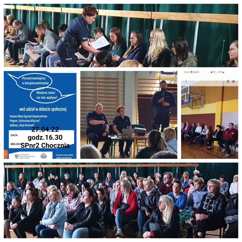 Przeprowadzona debata umożliwiła przybliżenie rodzicom uczniów naszej szkoły działania i sposoby umieszczania punktów zagrożeń ( miejsca na terenie Choczni, które mogą stanowić zagrożenie dla dzieci i młodzieży) „Krajowej Mapy Zagrożeń Bezpieczeństwa” oraz aplikacji „Moja Komenda”, stanowiących wsparcie policji na rzecz diagnozowania aktualnych zagrożeń. Spotkanie rozpoczęła Pani Małgorzata Hombesch wyjaśniając cel spotkania oraz omówiła dotychczasową , długoletnią współpracę ze szkołą . Pan Maciej Zaremba wyjaśnił zasady działania aplikacji „Krajowa Mapa Zagrożeń Bezpieczeństwa” oraz przedstawił zdiagnozowane, w oparciu o przedmiotowe narzędzie, problemy. Kolejnym elementem debaty było omówienie przydatności aplikacji „Moja Komenda” oraz założeń programu "Dzielnicowy Bliżej Nas". Na koniec przystąpiono do dialogu, rodzice wypełnili ewaluacyjną ankietę. Pan Mateusz Fidelus – dzielnicowy Choczni zachęcał mieszkańców do zgłaszania na bieżąco niepokojących zdarzeń czy miejsc, w których gromadzi się młodzież, przejawiająca symptomy niedostosowania społecznego.