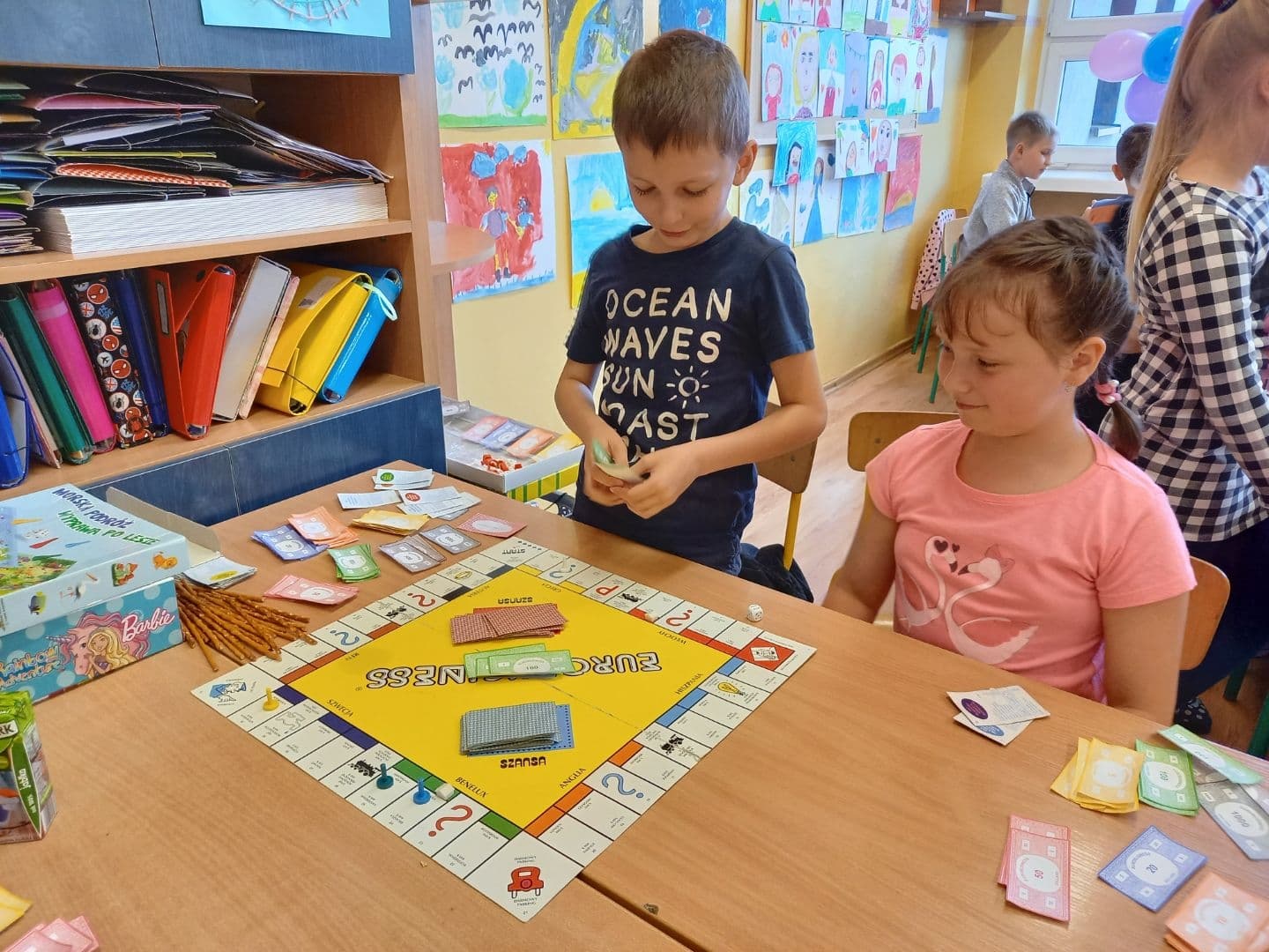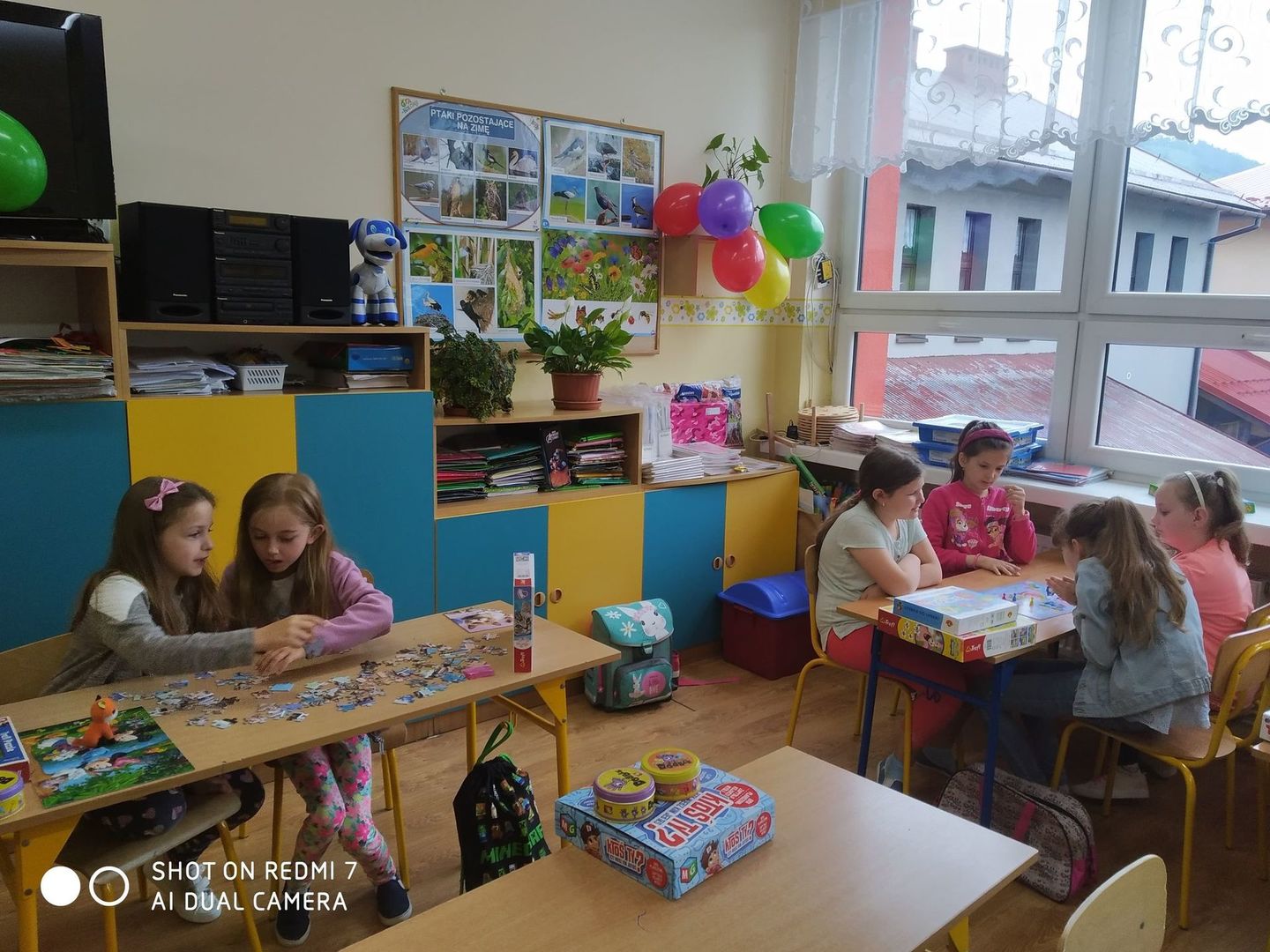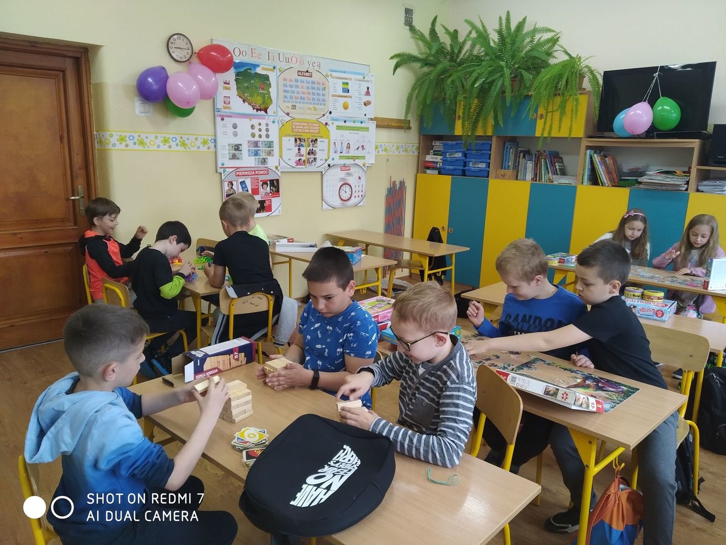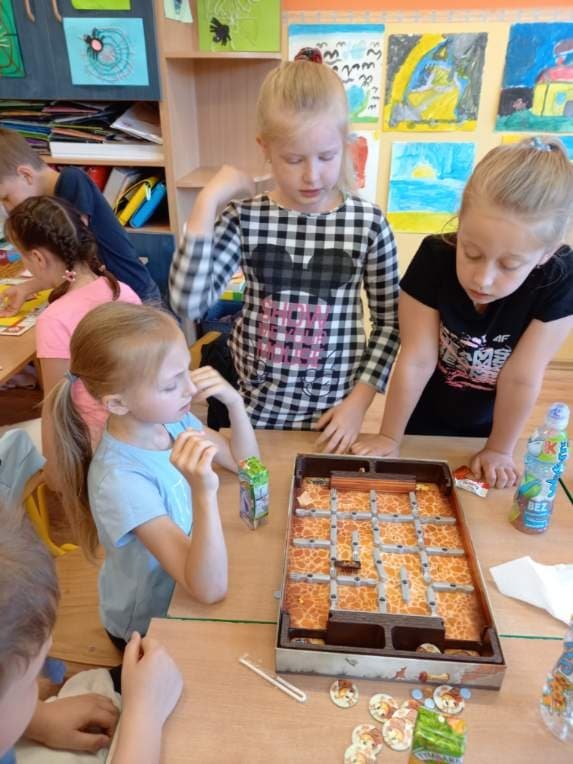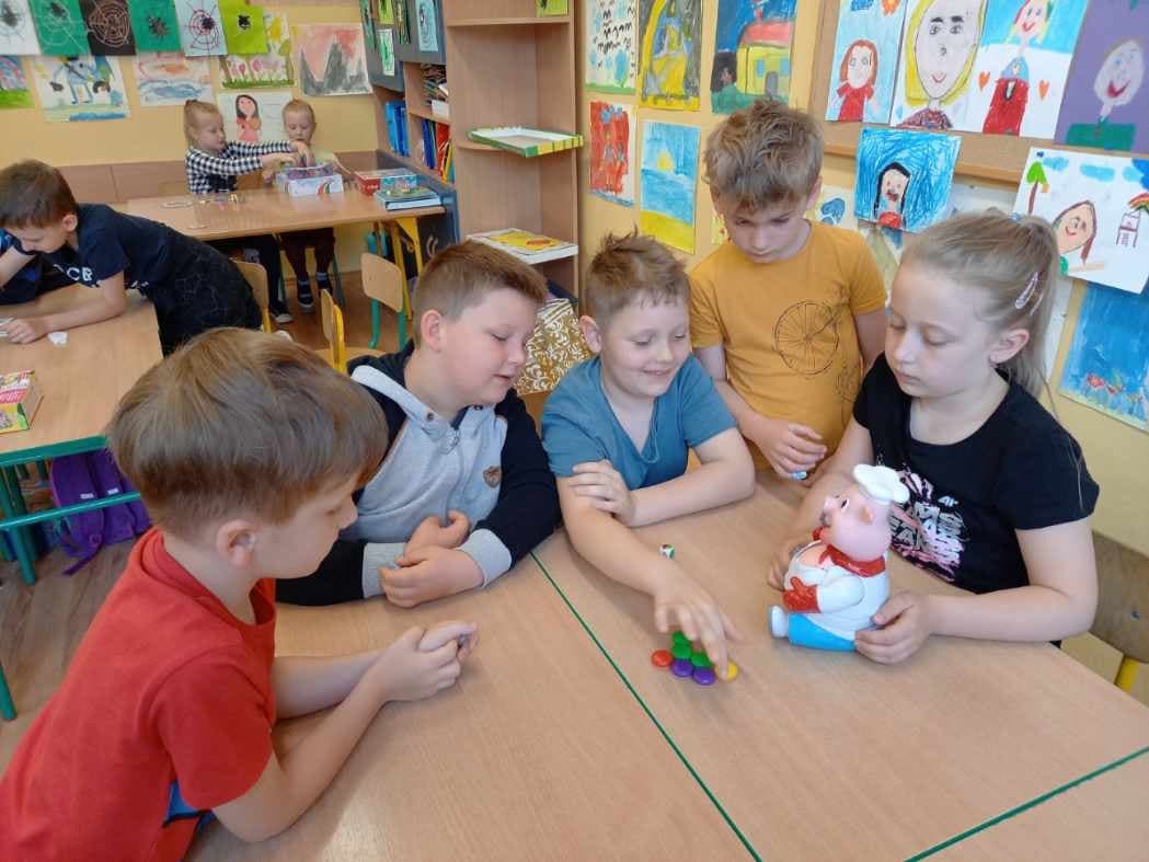 Dzisiaj w Dniu Dziecka uczniowie z klasy pierwszej i drugiej grali w swoje ulubione gry, układali klocki konstrukcyjne i puzzle. Wszyscy świetnie się bawili i w prezencie za wesołą rywalizację otrzymali soczki, ciastka i kolorowe balony.