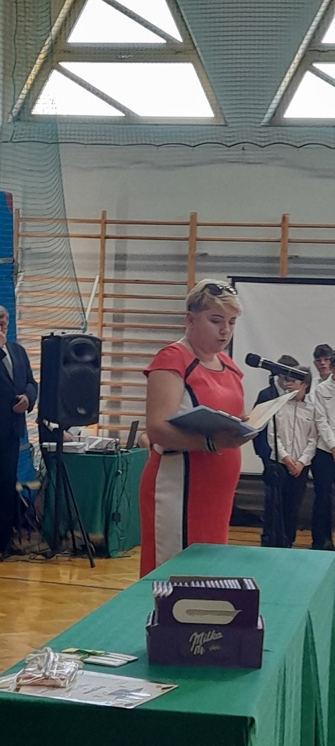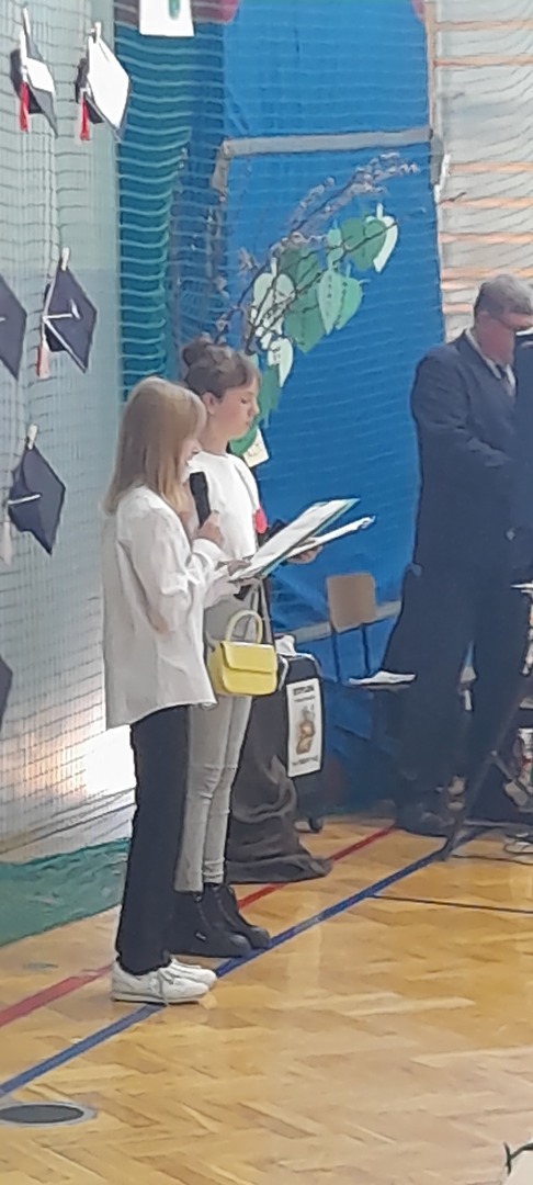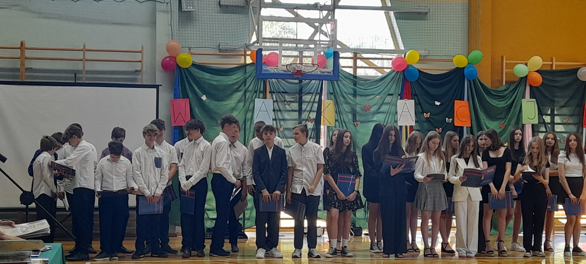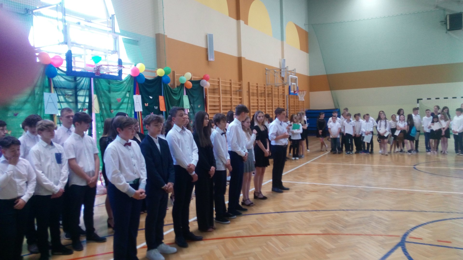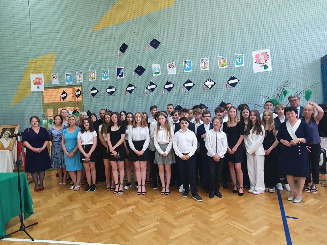W piatek tj. 24 czerwca 2022r zakończyliśmy rok szkolny 2021/2022. Najpierw uczestniczyliśmy we mszy świętej a nastepnie odbyła się uroczystośc na sali gimnastycznej w szkole z udziałem uczniów, rodziców i pracowników szkoły. Na początek Pani dyrektor Małgorzata Bryndza podsumowała rok szkolny, rozdała świadectwa z wyróżnieniem, świadectwa ukończenia szkoły klasom ósmym a następnie odbyło się rozdanie nagród dla wyróżnionych uczniów. Pani Dyrektor wręczyła również listy gratulacyjne rodzicom uczniów, którzy otrzymali świadectwa z wyróżnieniem. W czasie uroczystości wystąpili przedstawiciele Rady Rodziców, którzy pożegnali czterech z grona nauczycieli. Pani Bogusia Gregorczyk, pani Bogusia Kowalczyk oraz pan Zbigniew Kolber odchodzą na zasłużoną emeryturę. Natomiast ksiądz Michał został przeniesiony do innej parafii. Po tej oficjalnej części klasy ósme przygotowały wraz z wychowawcami krótką pożegnalną część artystyczną. Klasa siódma również pamiętała o absolwentach podarowując im małe pamiątki. Uroczystość zakończyła się pokazem prezentacji zdjęć klas ósmych.