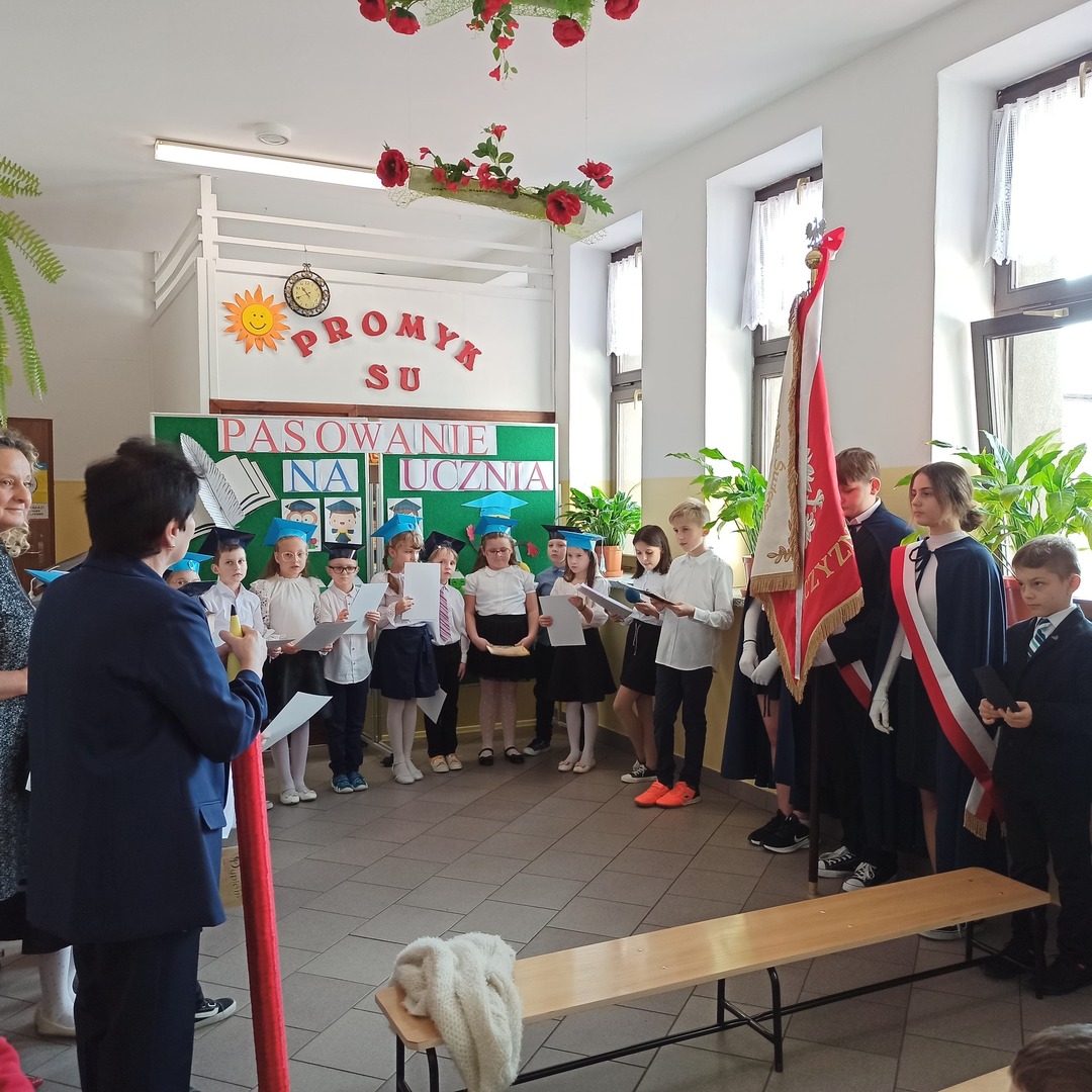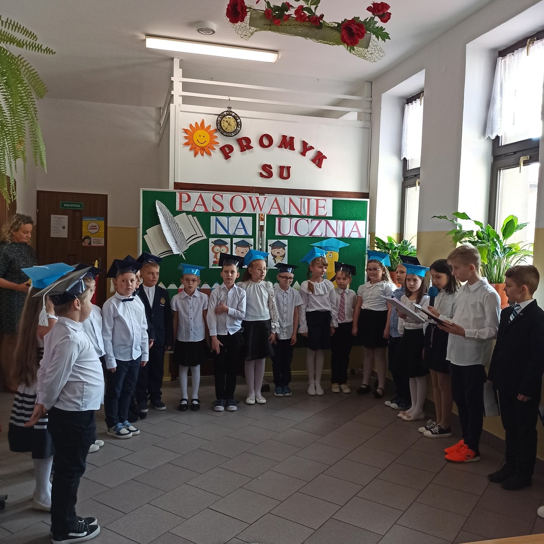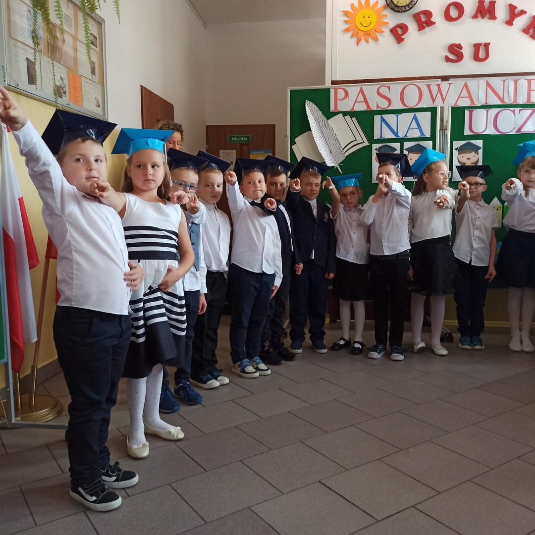 W dniu 25 października przyjęliśmy pierwszoklasistów w poczet uczniów naszej szkoły. Dzieci zaprezentowały krótki program artystyczny, podczas którego pięknie śpiewały i recytowały wiersze. Po występie dzieci uroczyście ślubowały oraz zostały pasowane na uczniów przez panią dyrektor. Otrzymały również dyplomy i stały się pełnoprawnymi czytelnikami biblioteki szkolnej. Następnie przedstawiciele trzeciej klasy powitali ich w społeczności szkolnej i wręczyli upominki. Po zakończeniu części oficjalnej uczestnicy uroczystości udali się na słodki poczęstunek.