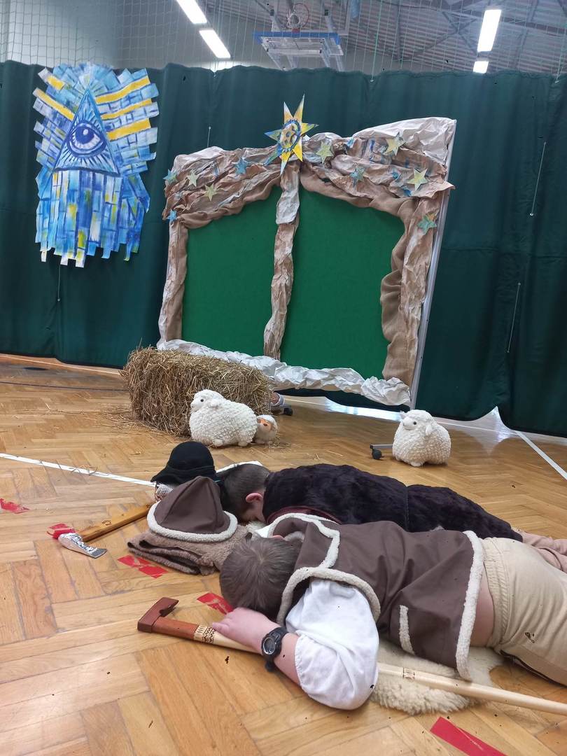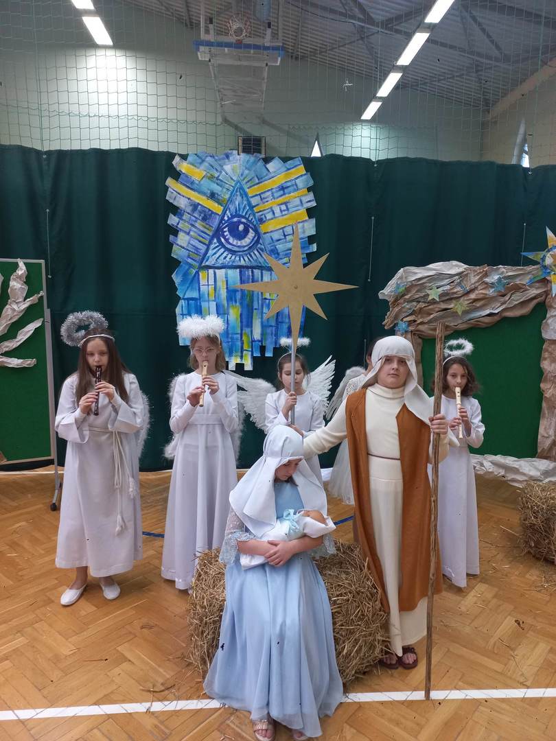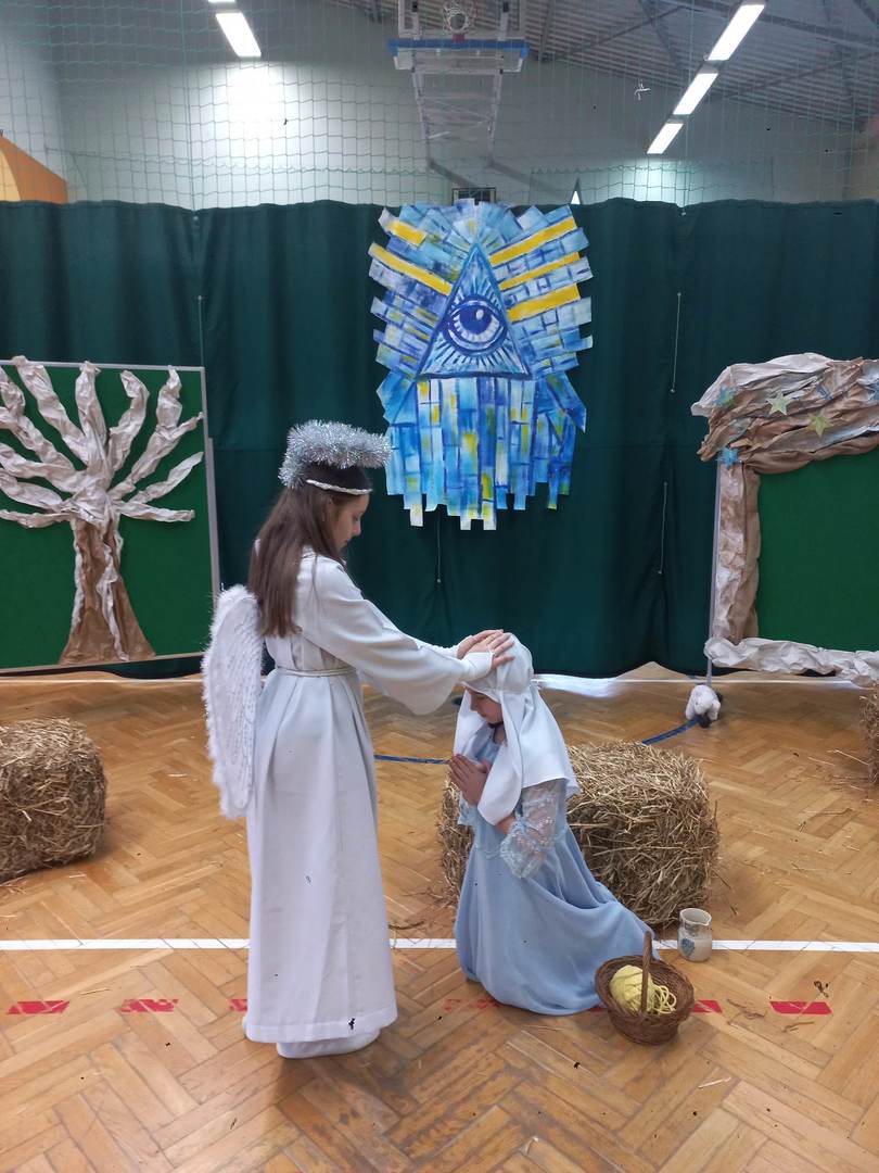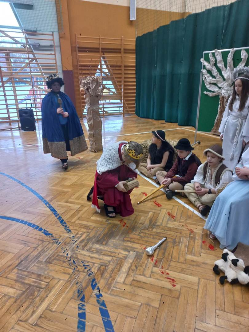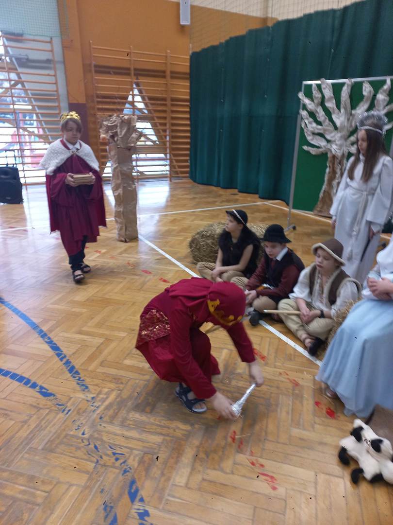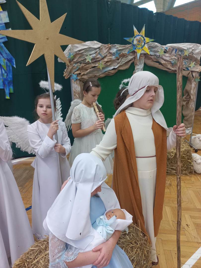 Czwartek, 22 grudnia był wyjątkowym dniem w naszej szkole. Wszyscy spotkaliśmy się z samego rana na uroczystym apelu - przedstawieniu bożonarodzeniowym. Klasa IV wraz z wychowawcą Renatą Ryś przygotowała pantomimę, która w refleksyjny sposób wprowadziła nas w tajemnicę Świąt Bożego Narodzenia. Czwartoklasiści przypomnieli historię człowieka od czasów Adama i Ewy, poprzez czasy narodzenia Jezusa aż do dnia dzisiejszego. Uczniowie znakomicie wcielili się w powierzone im role i z ogromną odpowiedzialnością podeszli do powierzonych im zadań. Udało im się zaciekawić zarówno zerówkowicza, starszego kolegę jak i również dorosłego odbiorcę. Dla wielu był to niezwykle wzruszający czas...