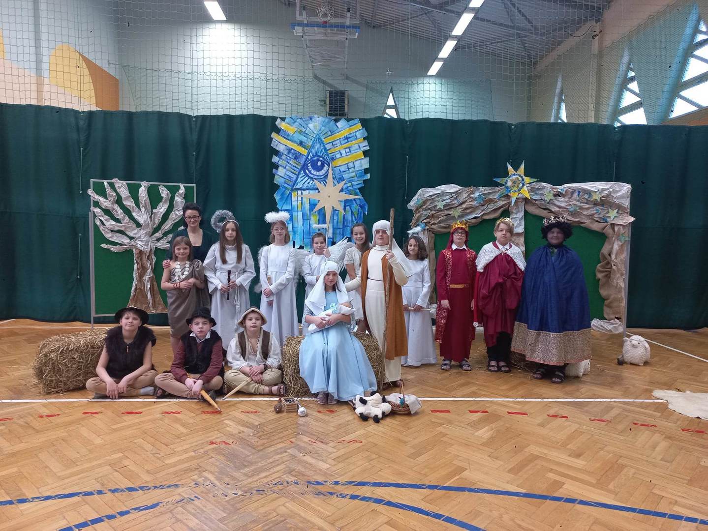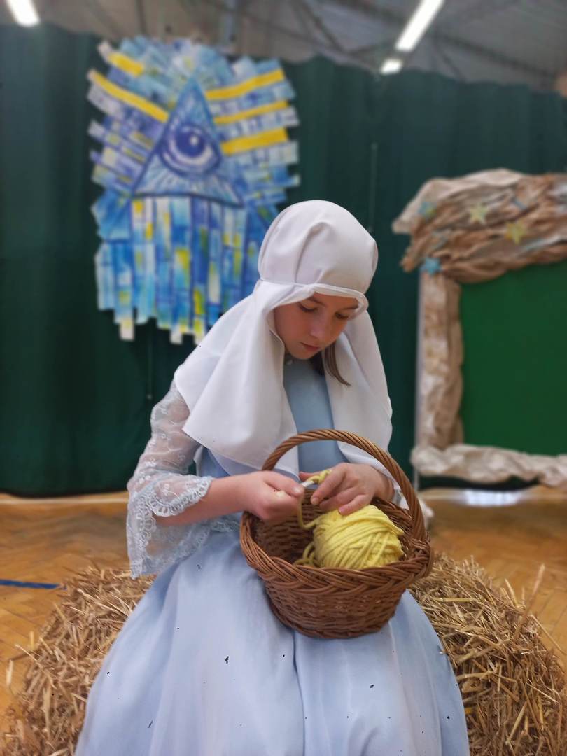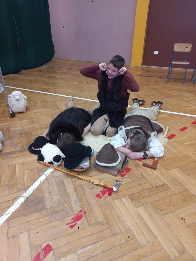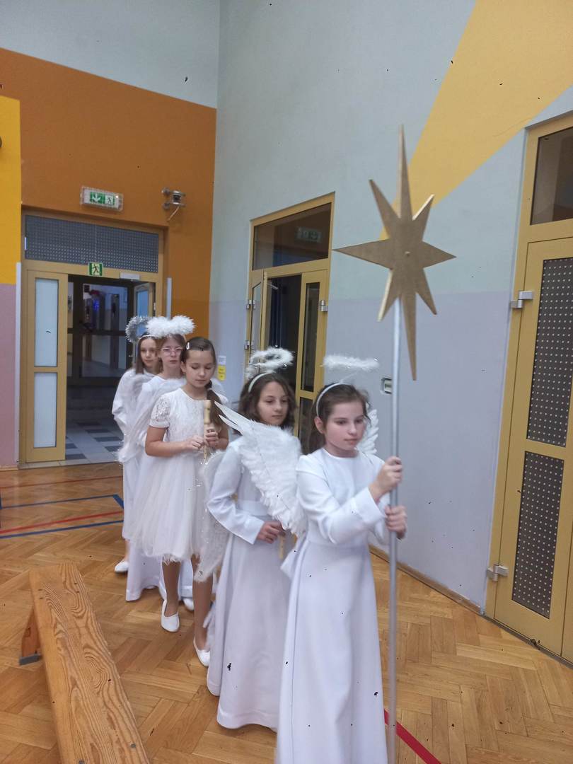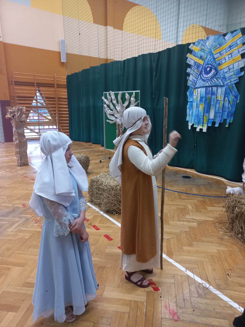 Czwartek, 22 grudnia był wyjątkowym dniem w naszej szkole. Wszyscy spotkaliśmy się z samego rana na uroczystym apelu - przedstawieniu bożonarodzeniowym. Klasa IV wraz z wychowawcą Renatą Ryś przygotowała pantomimę, która w refleksyjny sposób wprowadziła nas w tajemnicę Świąt Bożego Narodzenia. Czwartoklasiści przypomnieli historię człowieka od czasów Adama i Ewy, poprzez czasy narodzenia Jezusa aż do dnia dzisiejszego. Uczniowie znakomicie wcielili się w powierzone im role i z ogromną odpowiedzialnością podeszli do powierzonych im zadań. Udało im się zaciekawić zarówno zerówkowicza, starszego kolegę jak i również dorosłego odbiorcę. Dla wielu był to niezwykle wzruszający czas...