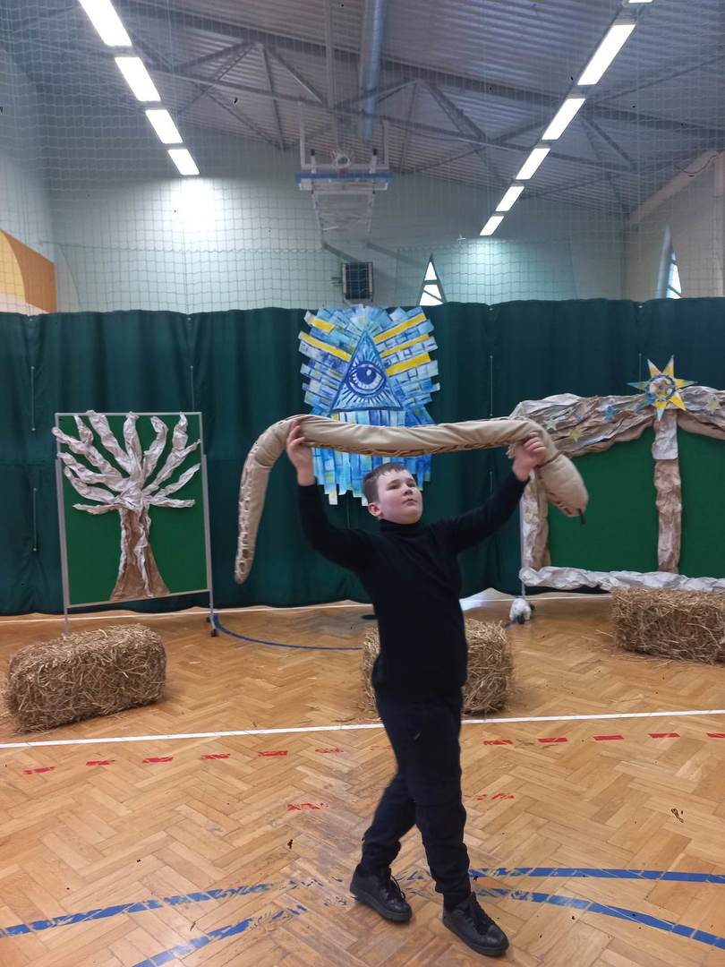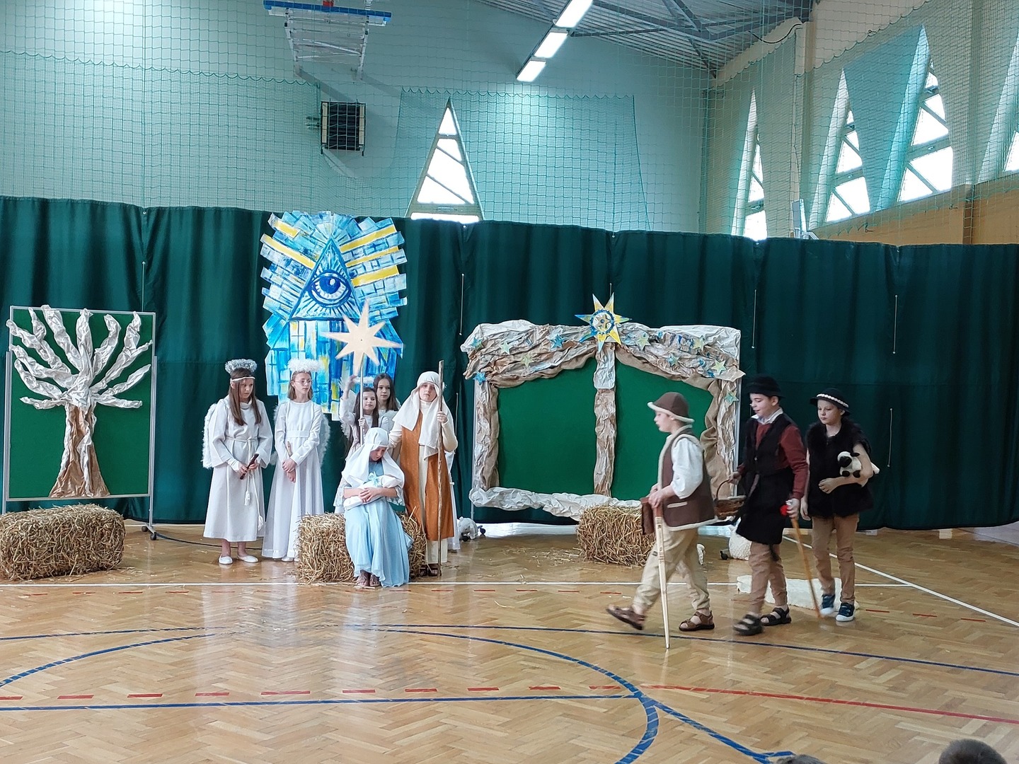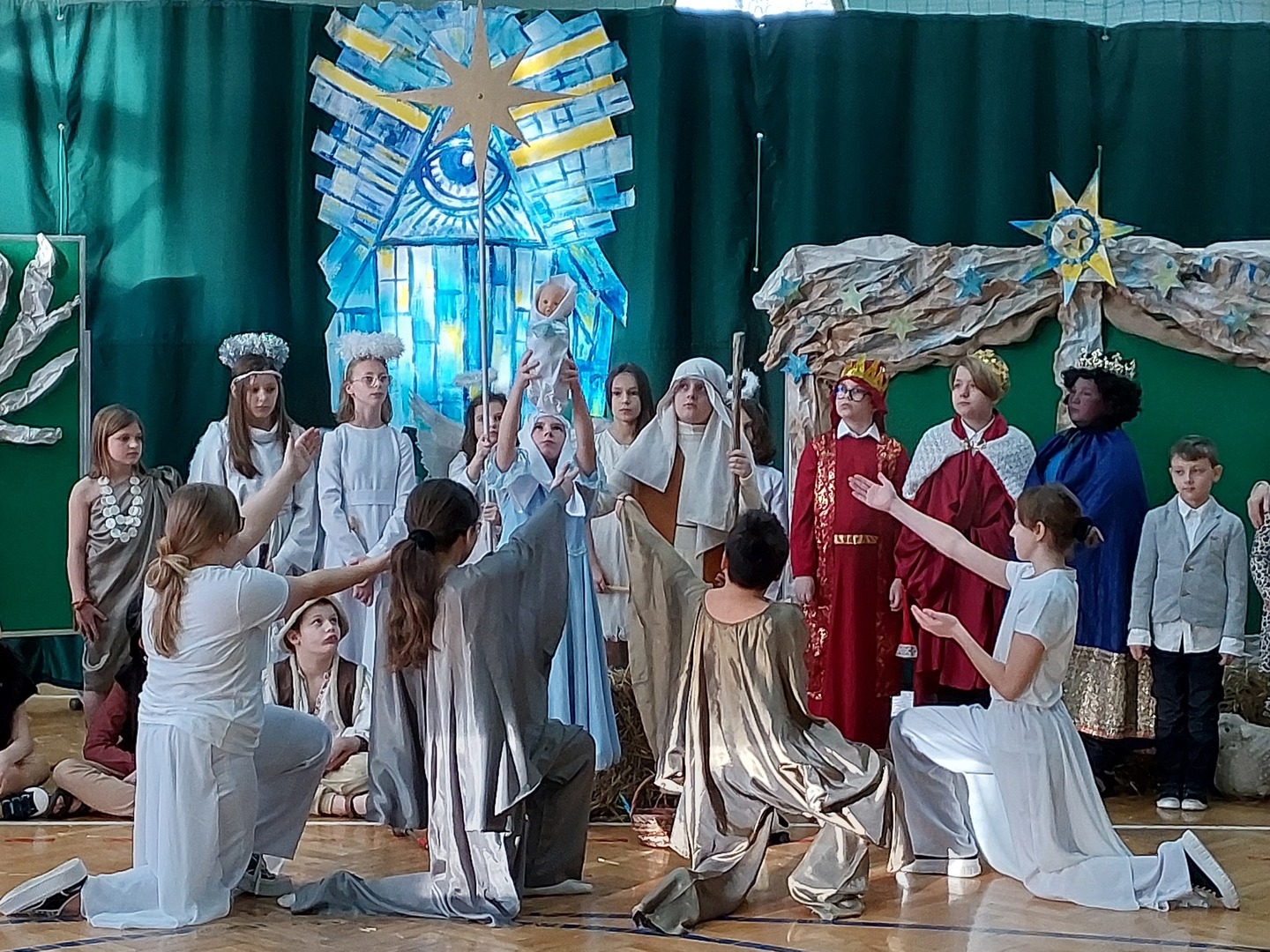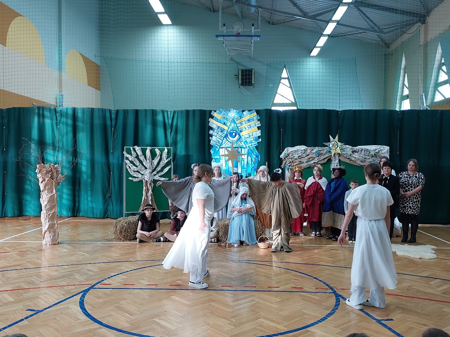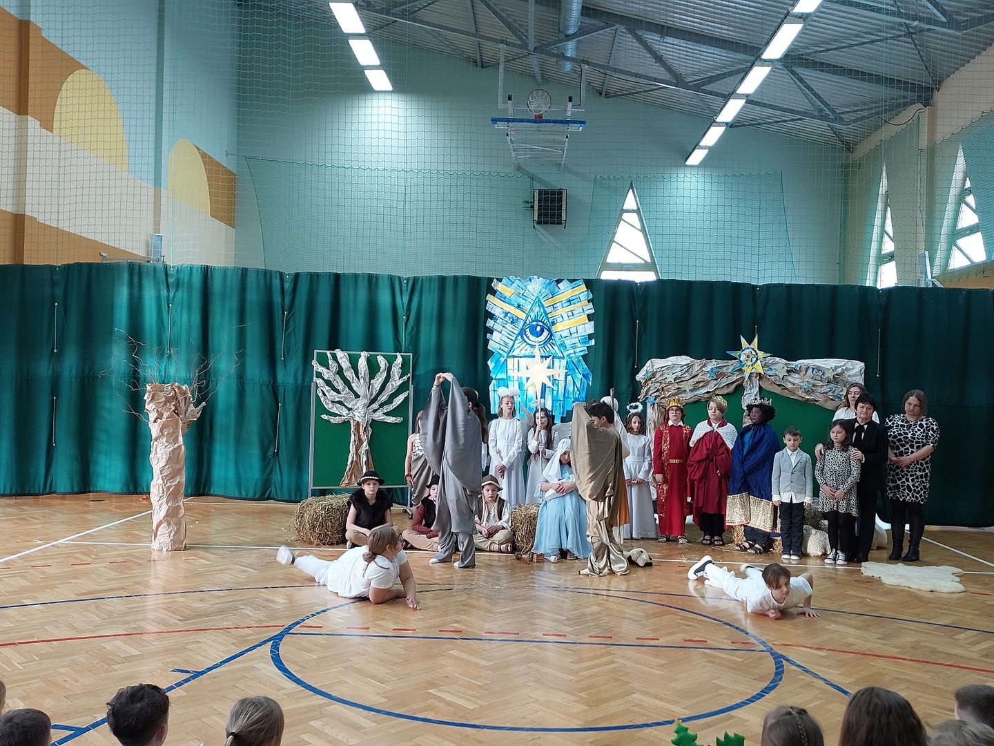 Czwartek, 22 grudnia był wyjątkowym dniem w naszej szkole. Wszyscy spotkaliśmy się z samego rana na uroczystym apelu - przedstawieniu bożonarodzeniowym. Klasa IV wraz z wychowawcą Renatą Ryś przygotowała pantomimę, która w refleksyjny sposób wprowadziła nas w tajemnicę Świąt Bożego Narodzenia. Czwartoklasiści przypomnieli historię człowieka od czasów Adama i Ewy, poprzez czasy narodzenia Jezusa aż do dnia dzisiejszego. Uczniowie znakomicie wcielili się w powierzone im role i z ogromną odpowiedzialnością podeszli do powierzonych im zadań. Udało im się zaciekawić zarówno zerówkowicza, starszego kolegę jak i również dorosłego odbiorcę. Dla wielu był to niezwykle wzruszający czas...