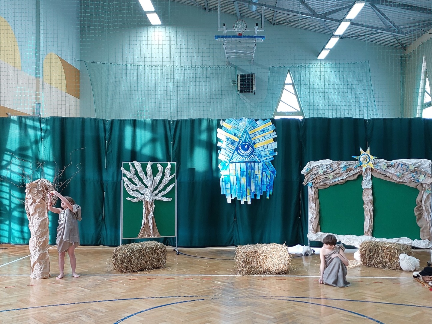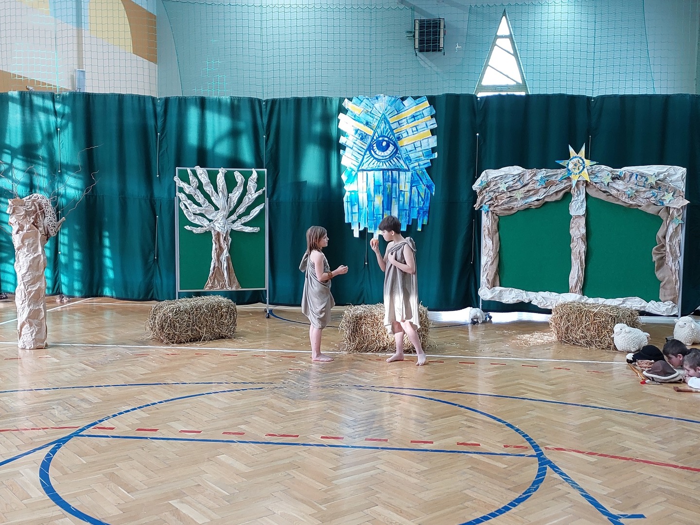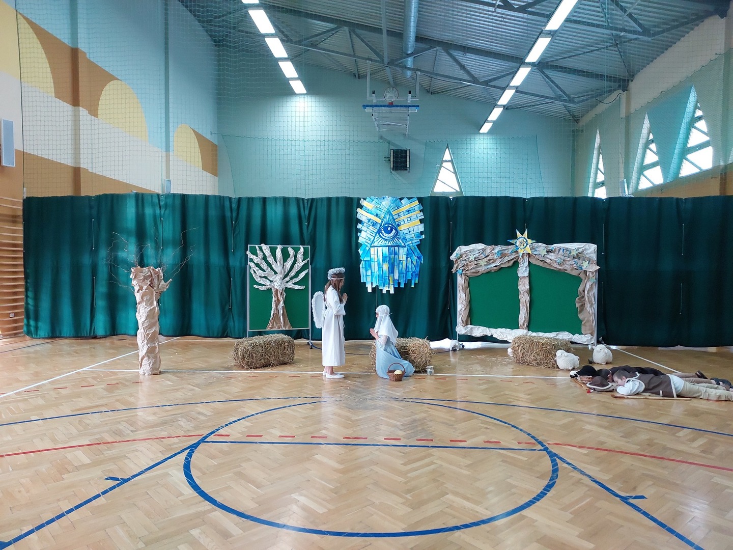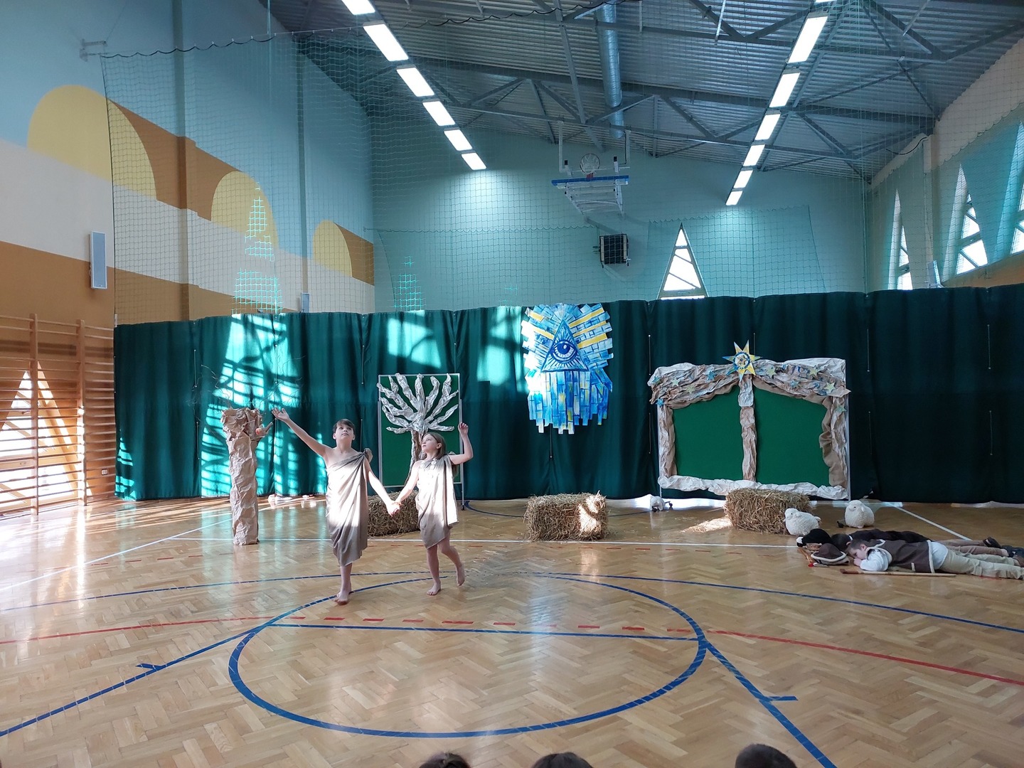 Czwartek, 22 grudnia był wyjątkowym dniem w naszej szkole. Wszyscy spotkaliśmy się z samego rana na uroczystym apelu - przedstawieniu bożonarodzeniowym. Klasa IV wraz z wychowawcą Renatą Ryś przygotowała pantomimę, która w refleksyjny sposób wprowadziła nas w tajemnicę Świąt Bożego Narodzenia. Czwartoklasiści przypomnieli historię człowieka od czasów Adama i Ewy, poprzez czasy narodzenia Jezusa aż do dnia dzisiejszego. Uczniowie znakomicie wcielili się w powierzone im role i z ogromną odpowiedzialnością podeszli do powierzonych im zadań. Udało im się zaciekawić zarówno zerówkowicza, starszego kolegę jak i również dorosłego odbiorcę. Dla wielu był to niezwykle wzruszający czas...