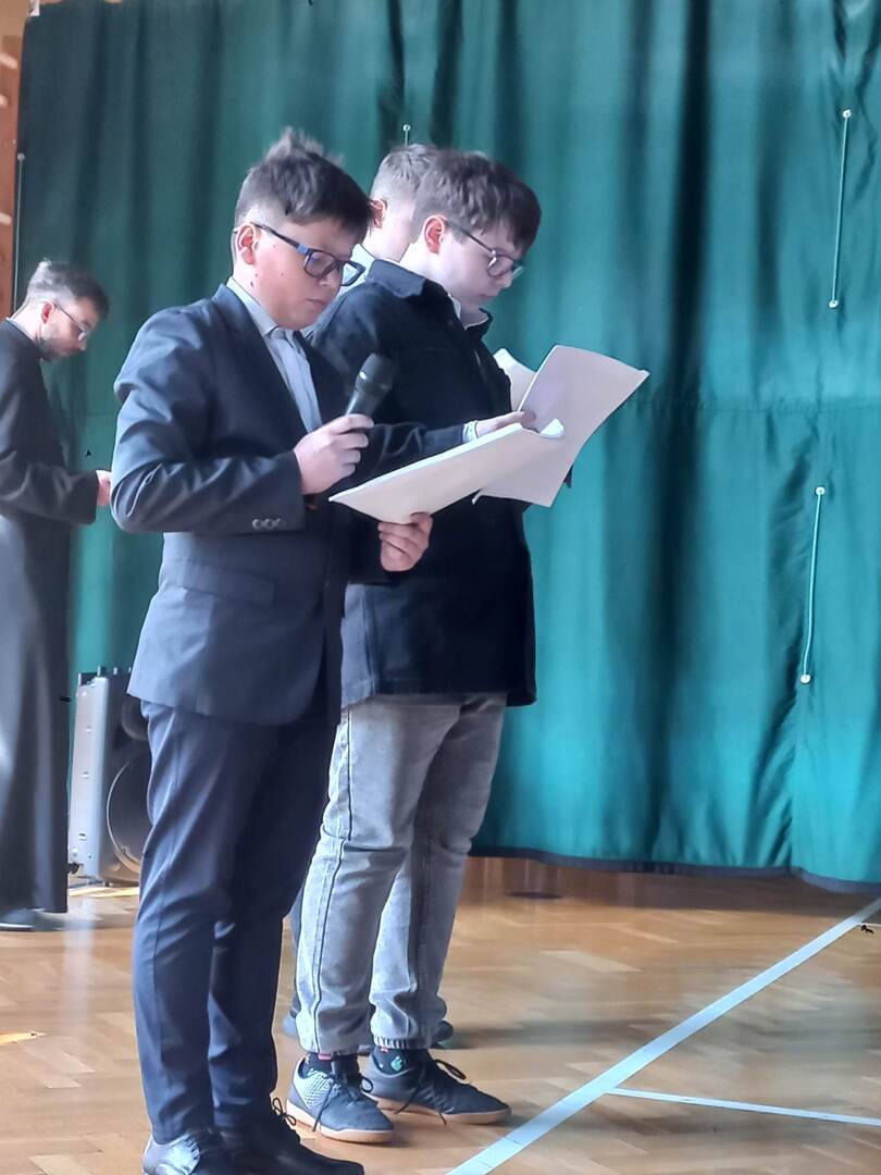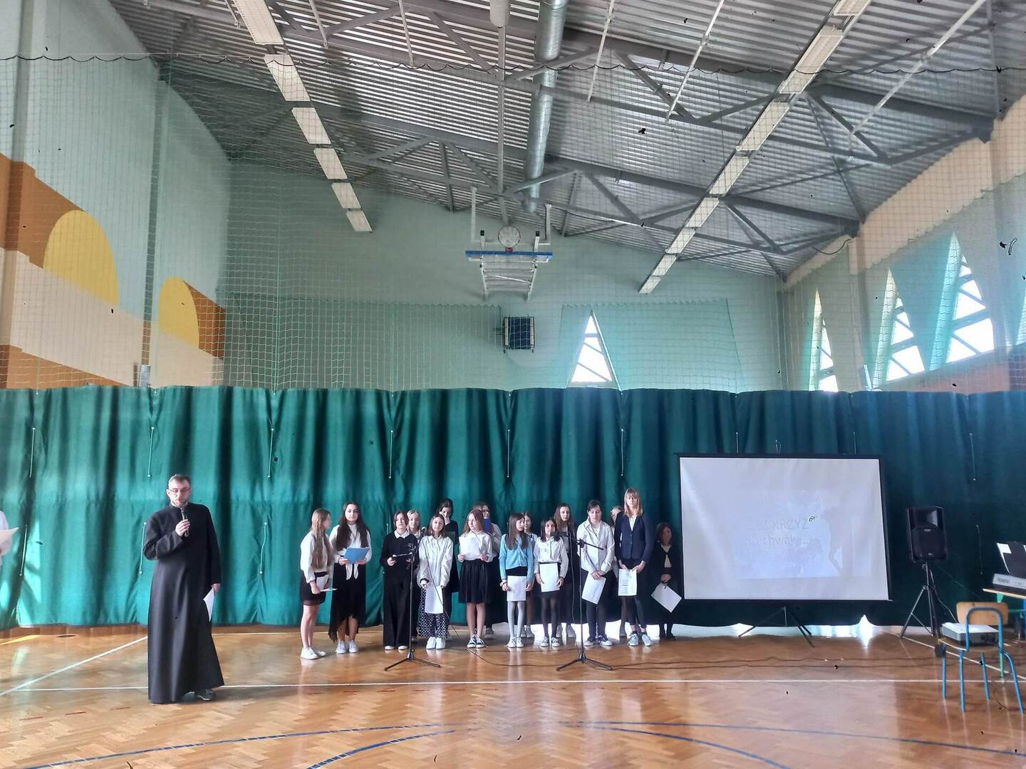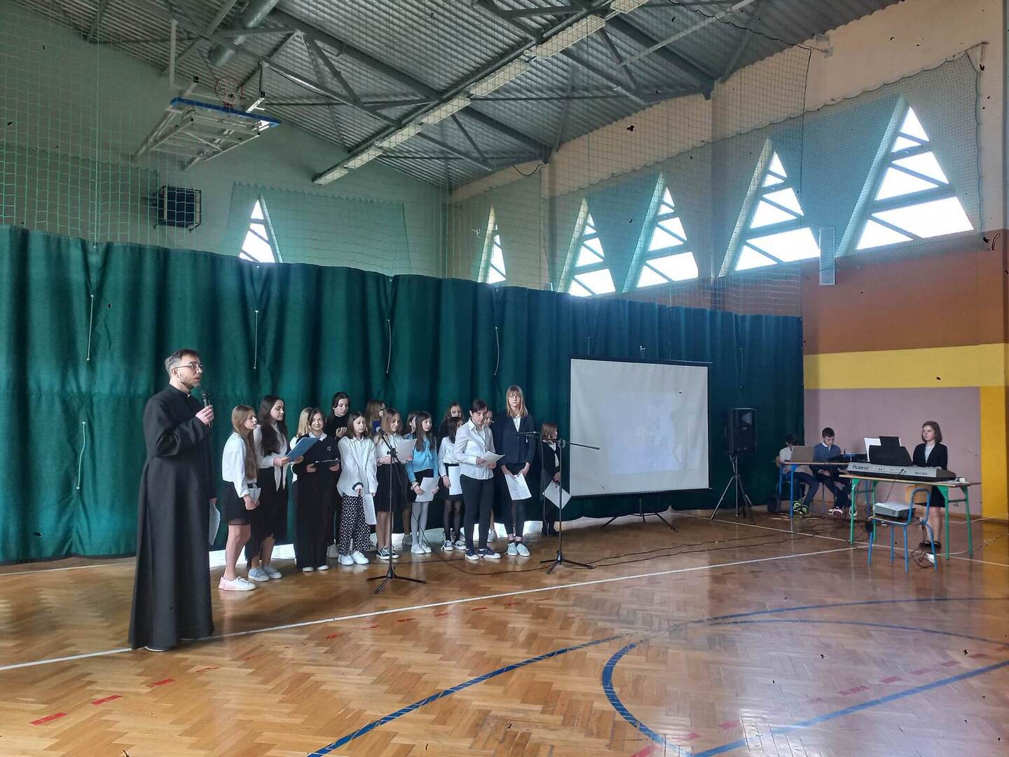 W środę 4 kwietnia wybrani uczniowie klas 4-8 pod opieką księdza Adama wprowadzili nas w nastrój nadchodzących Świąt. Uczniowie przygotowali montaż słowno - muzyczny, bogaty w refleksyjne pieśni wielkopostne i wielkanocne. Starsi uczniowie przypomnieli symbolikę krzyża, który jest w centrum nadchodzących Świąt. Na zakończenie Ksiadz Adam przekazał życzenia świąteczne całej społeczności szkolnej oraz wszystkim rodzicom. Do życzeń dołączył się również Samorząd szkolny.