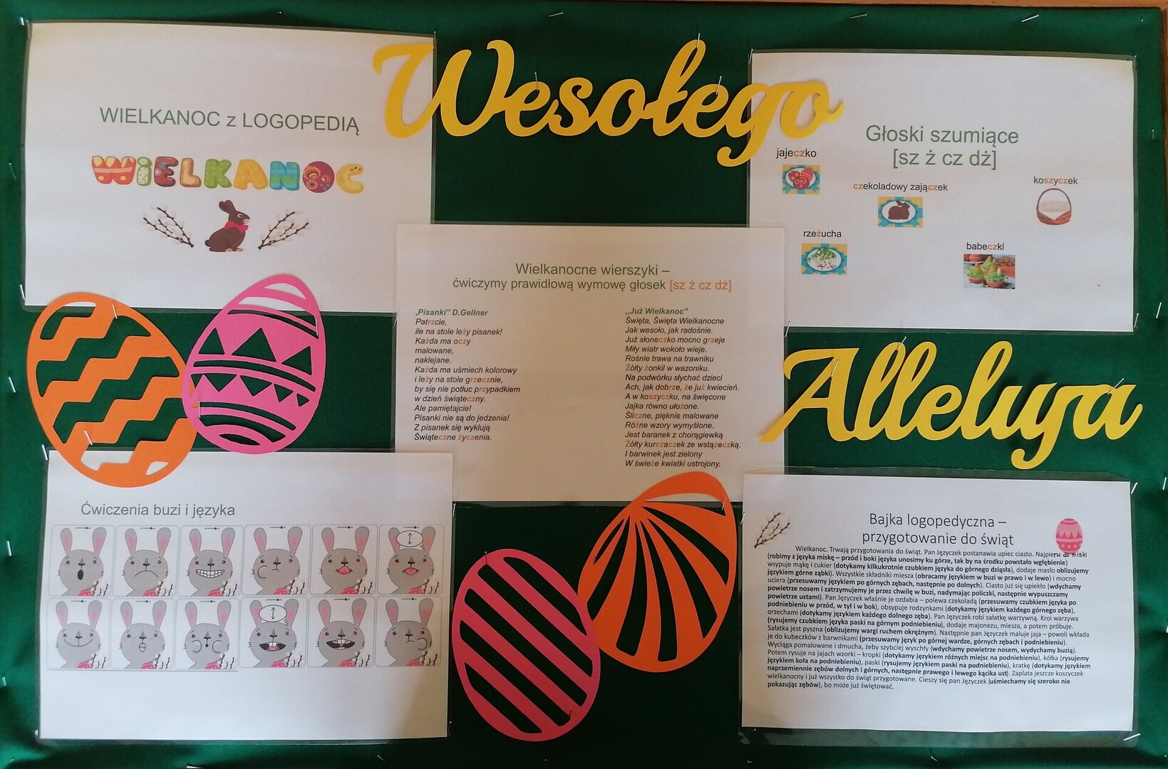 Przed Świętami Wielkanocnymi dzieci miały okazję utrwalać prawidłową wymowę głosek podczas zajęć z papierowymi jajeczkami, zajączkami, barankami. Wykonywaliśmy także ćwiczenia oddechowe oraz usprawniające narządy mowy. Wykonana w salce logopedycznej gazetka, przypominała dzieciom o ćwiczeniach w przerwie świątecznej.
