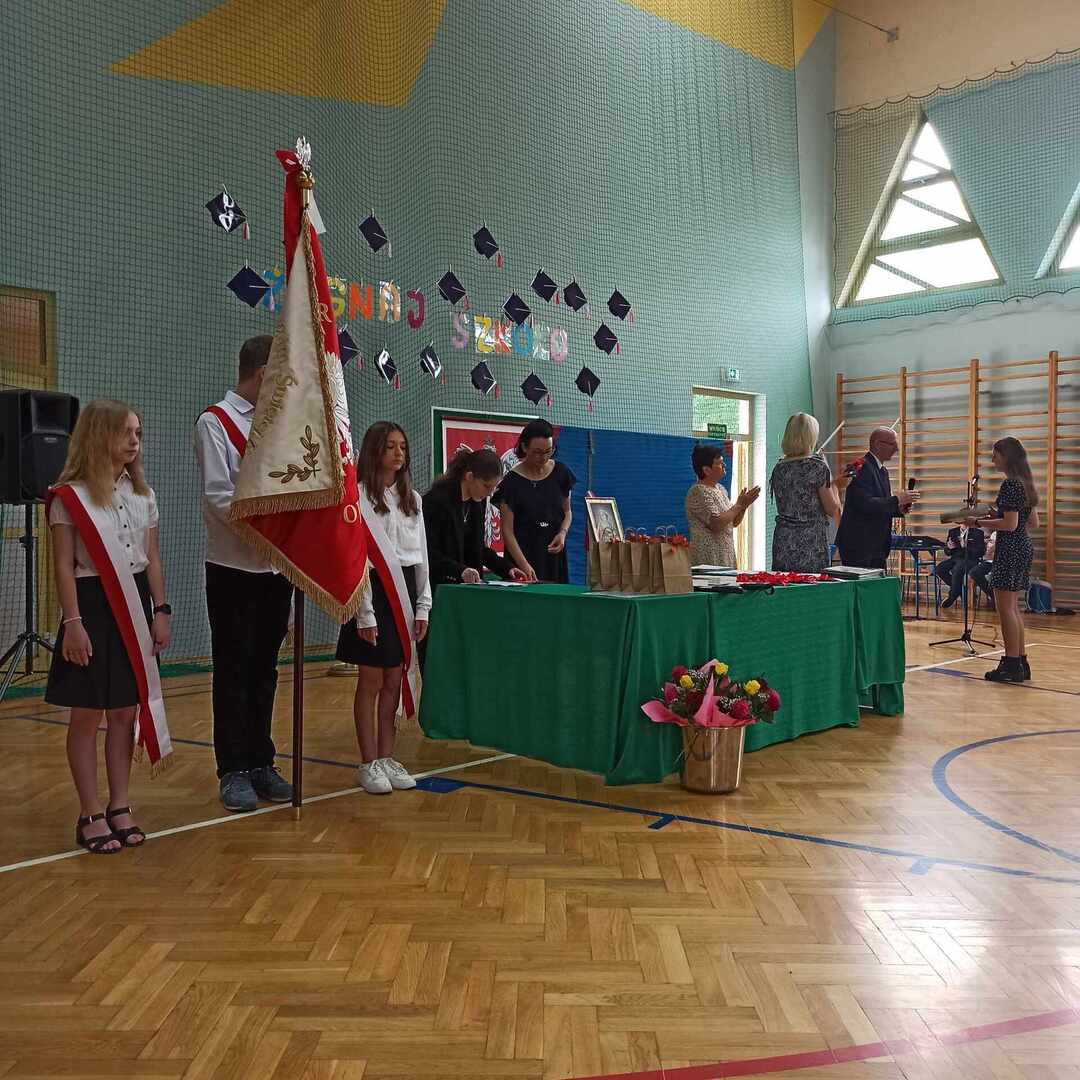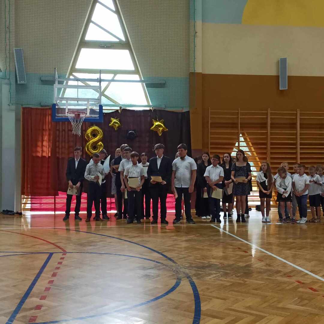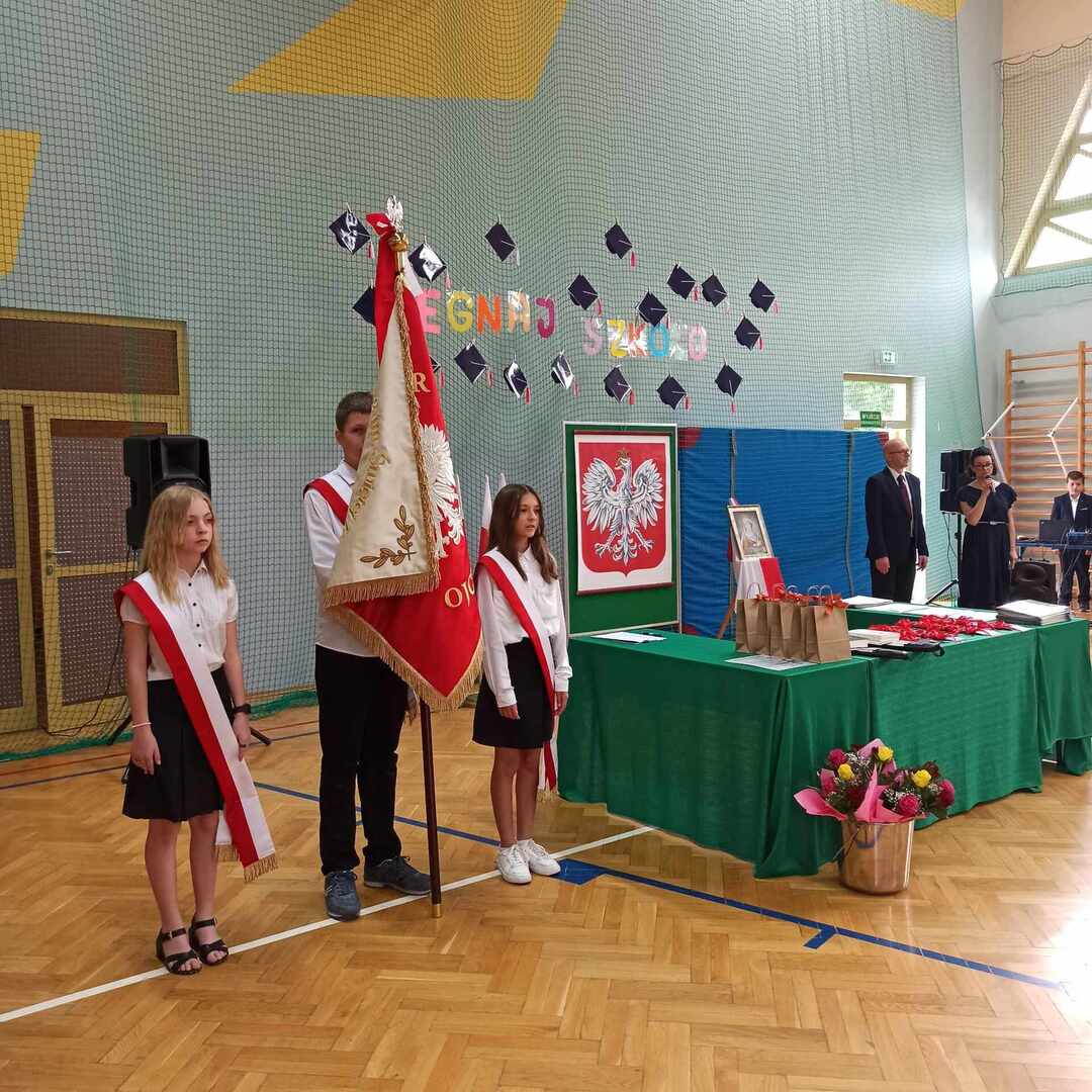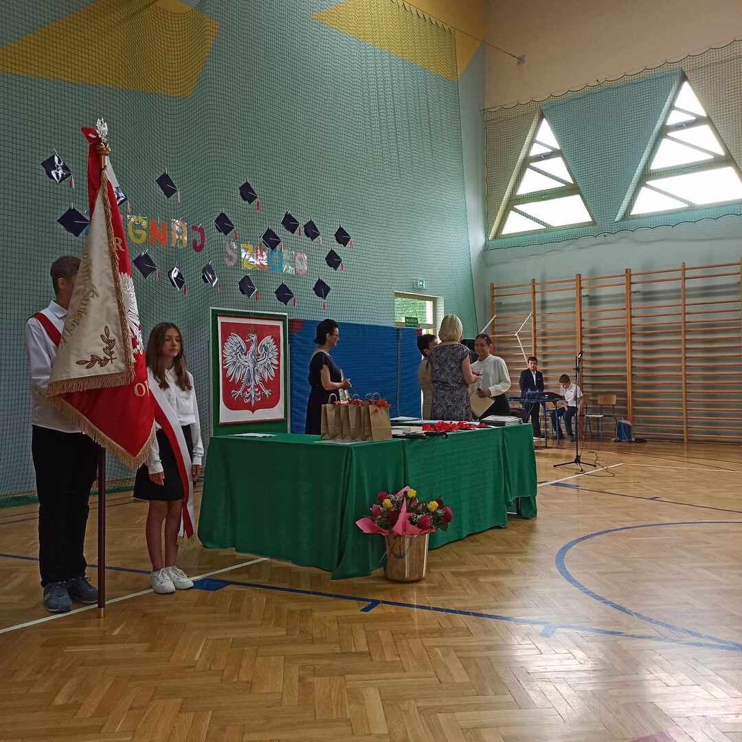 23 czerwca 2023 roku odbyło się uroczyste zakończenie roku szkolnego 2022/2023. Rozpoczęła je msza święta odprawiona przez księdza Adama w Kaplicy pod wezwaniem Matki Boskiej Częstochowskiej o godzinie 9. Po mszy przeszliśmy do sali gimnastycznej szkoły, towarzyszył nam szkolny sztandar . Po odśpiewaniu hymnów - państwowego oraz szkoły podstawowej głos zabrał pan Dyrektor, który podsumował kończący się rok szkolny, doceniając każdego ucznia, który podjął się jakiegokolwiek wysiłku, by się rozwijać. Następnie pan Dyrektor wraz z wychowawcami rozdali uczniom świadectwa z wyróżnieniem - 34 🙂 - oraz świadectwa ukończenia szkoły podstawowej. Rodzice dzieci wyróżniających się otrzymali listy gratulacyjne. Uczniowie: Ludwik Książek z kl.V oraz Maria Banaś z kl. VIII otrzymali nagrodę Dyrektora dla najlepszego ucznia szkoły podstawowej. W trakcie uroczystości odbyło się również podziękowanie za wieloletnią pracę i serce otwarte na uczniów a zarazem pożegnanie Pani Barbary Wolanin oraz Danuty Matkowskiej, które w tym roku odchodzą na zasłużoną emeryturę.