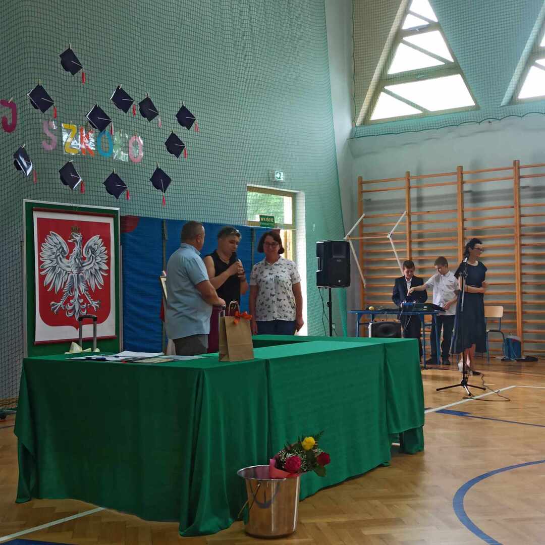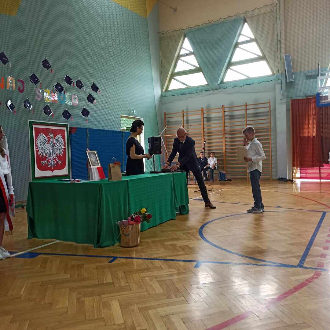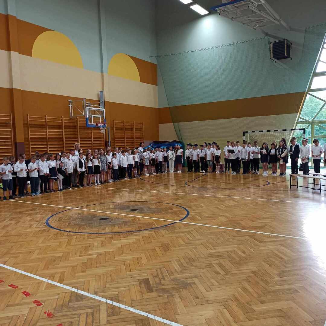 23 czerwca 2023 roku odbyło się uroczyste zakończenie roku szkolnego 2022/2023. Rozpoczęła je msza święta odprawiona przez księdza Adama w Kaplicy pod wezwaniem Matki Boskiej Częstochowskiej o godzinie 9. Po mszy przeszliśmy do sali gimnastycznej szkoły, towarzyszył nam szkolny sztandar . Po odśpiewaniu hymnów - państwowego oraz szkoły podstawowej głos zabrał pan Dyrektor, który podsumował kończący się rok szkolny, doceniając każdego ucznia, który podjął się jakiegokolwiek wysiłku, by się rozwijać. Następnie pan Dyrektor wraz z wychowawcami rozdali uczniom świadectwa z wyróżnieniem - 34 🙂 - oraz świadectwa ukończenia szkoły podstawowej. Rodzice dzieci wyróżniających się otrzymali listy gratulacyjne. Uczniowie: Ludwik Książek z kl.V oraz Maria Banaś z kl. VIII otrzymali nagrodę Dyrektora dla najlepszego ucznia szkoły podstawowej. W trakcie uroczystości odbyło się również podziękowanie za wieloletnią pracę i serce otwarte na uczniów a zarazem pożegnanie Pani Barbary Wolanin oraz Danuty Matkowskiej, które w tym roku odchodzą na zasłużoną emeryturę.