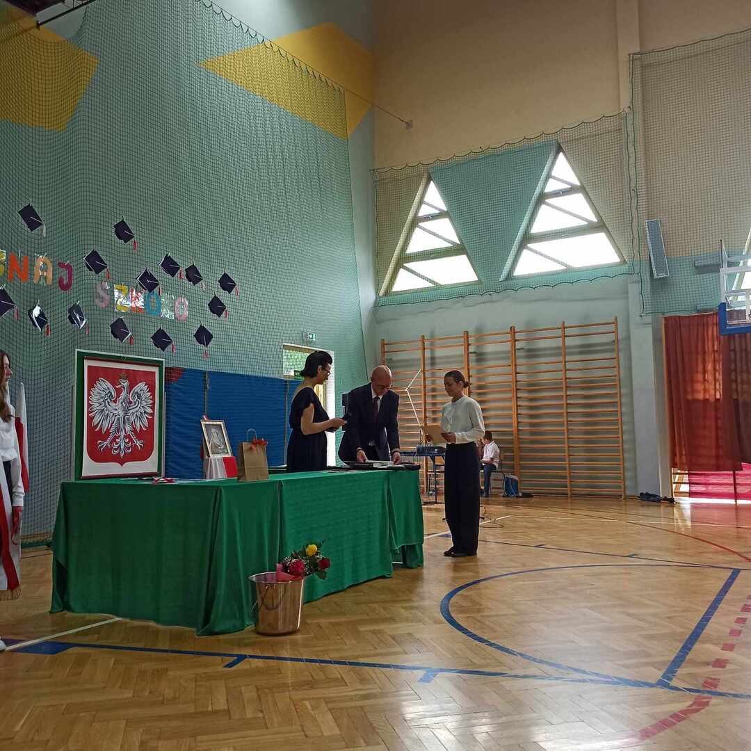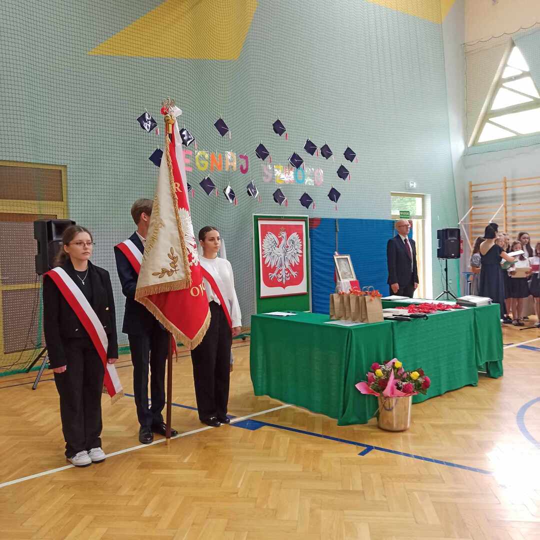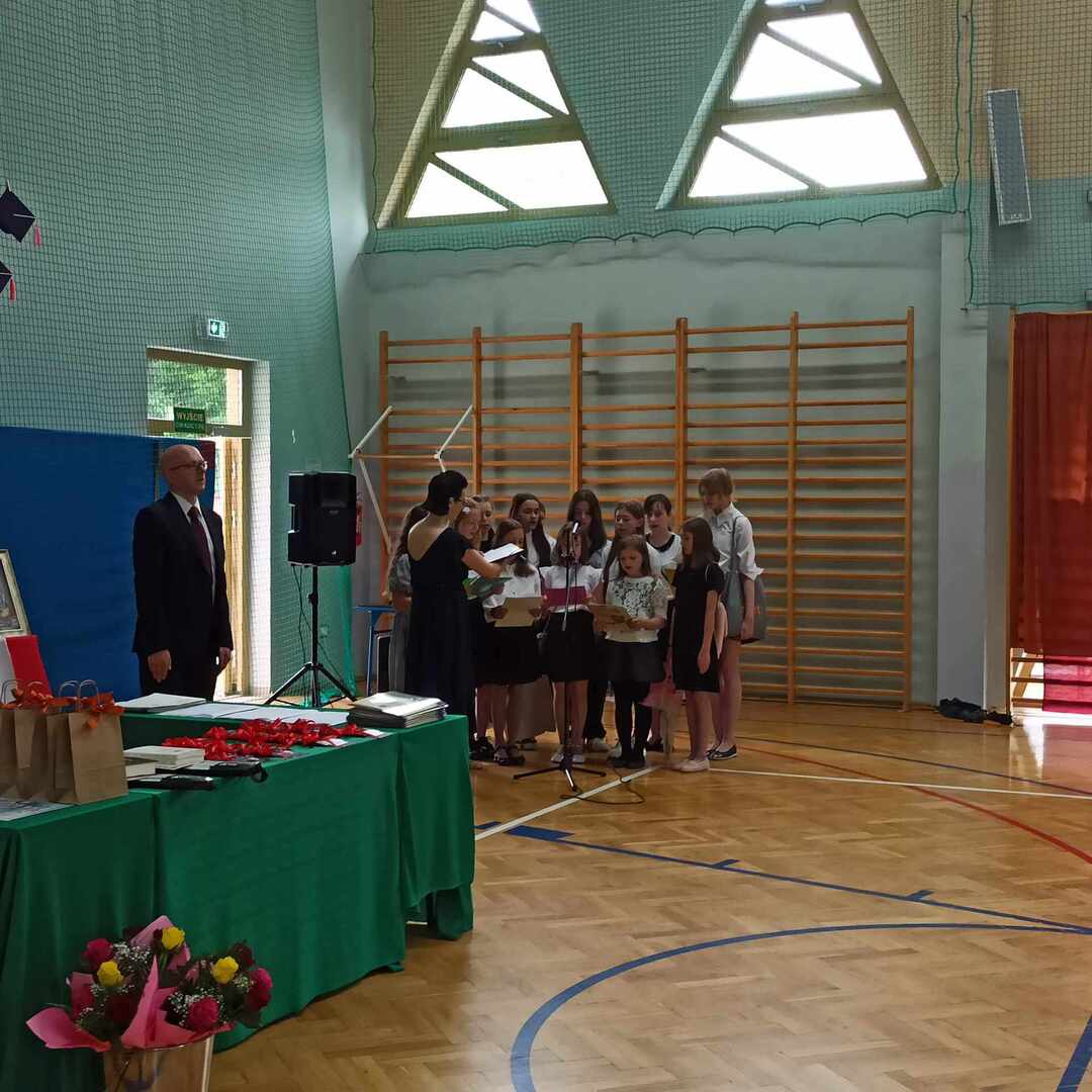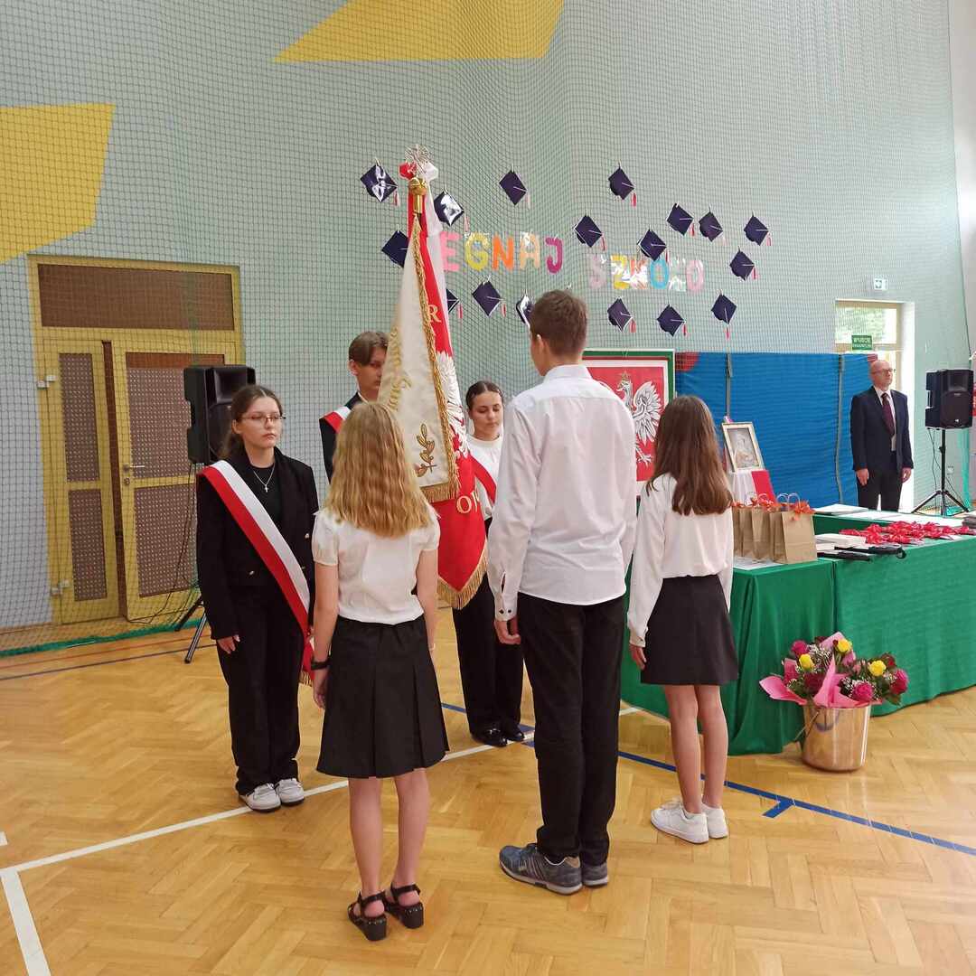 23 czerwca 2023 roku odbyło się uroczyste zakończenie roku szkolnego 2022/2023. Rozpoczęła je msza święta odprawiona przez księdza Adama w Kaplicy pod wezwaniem Matki Boskiej Częstochowskiej o godzinie 9. Po mszy przeszliśmy do sali gimnastycznej szkoły, towarzyszył nam szkolny sztandar . Po odśpiewaniu hymnów - państwowego oraz szkoły podstawowej głos zabrał pan Dyrektor, który podsumował kończący się rok szkolny, doceniając każdego ucznia, który podjął się jakiegokolwiek wysiłku, by się rozwijać. Następnie pan Dyrektor wraz z wychowawcami rozdali uczniom świadectwa z wyróżnieniem - 34 🙂 - oraz świadectwa ukończenia szkoły podstawowej. Rodzice dzieci wyróżniających się otrzymali listy gratulacyjne. Uczniowie: Ludwik Książek z kl.V oraz Maria Banaś z kl. VIII otrzymali nagrodę Dyrektora dla najlepszego ucznia szkoły podstawowej. W trakcie uroczystości odbyło się również podziękowanie za wieloletnią pracę i serce otwarte na uczniów a zarazem pożegnanie Pani Barbary Wolanin oraz Danuty Matkowskiej, które w tym roku odchodzą na zasłużoną emeryturę.